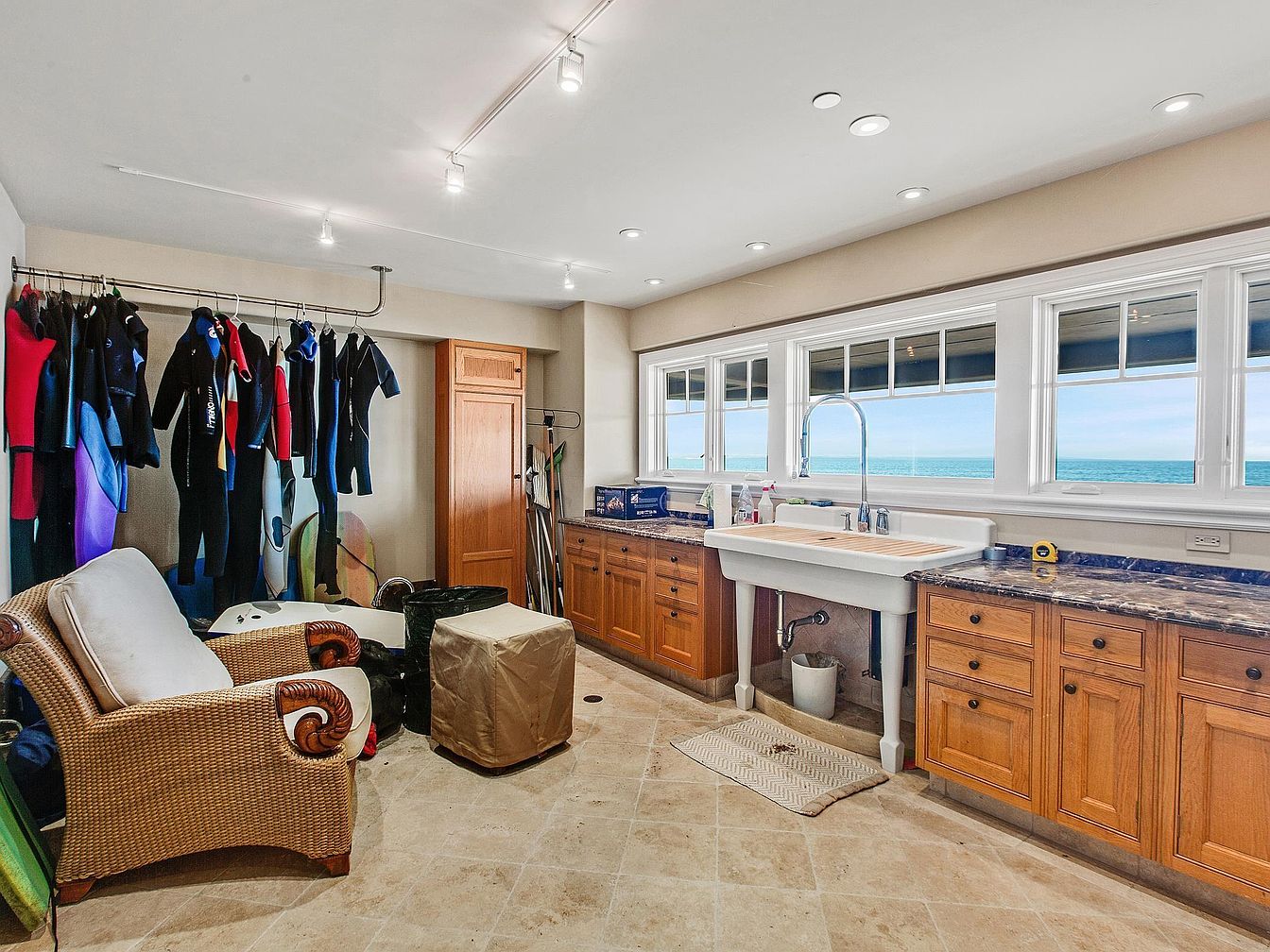 Expansive laundry and mudroom with panoramic ocean views, offering both functionality and coastal charm. The space includes a wall of large windows that fill the room with natural light and frame stunning water scenery. Warm wood cabinets provide ample storage and are topped with dark, sophisticated countertops. A deep farmhouse sink is perfect for rinsing gear or handling household tasks. The tiled floor is practical for sandy feet and wet items, while racks of wetsuits and surfboards highlight the room’s family-friendly, active lifestyle. A wicker armchair adds comfort, making this multipurpose room both inviting and highly usable for beachside living.