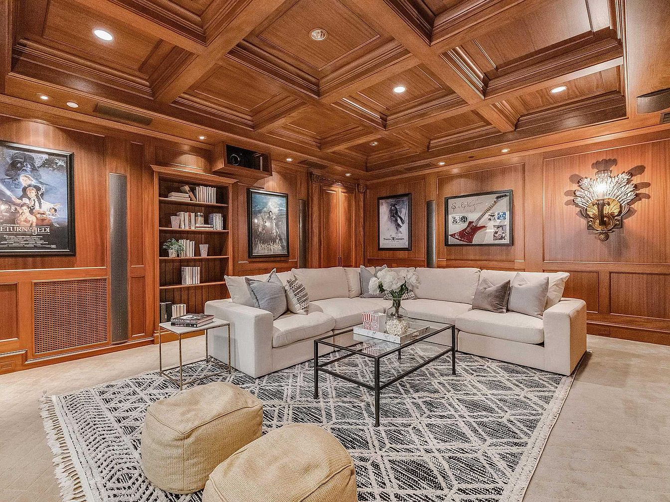 Warm wood paneling and a dramatic coffered ceiling create an inviting yet sophisticated atmosphere in this home theater lounge. A spacious, L-shaped cream sectional anchors the room, offering ample seating for movie nights or family gatherings. Classic film posters and built-in shelves filled with books add personality, while a geometric area rug defines the seating area. Plush poufs provide flexible seating, perfect for kids to relax. Recessed lighting and a unique wall sconce offer both task and ambient illumination, blending classic and contemporary elements for a cozy, family-friendly retreat that encourages relaxation and entertainment.