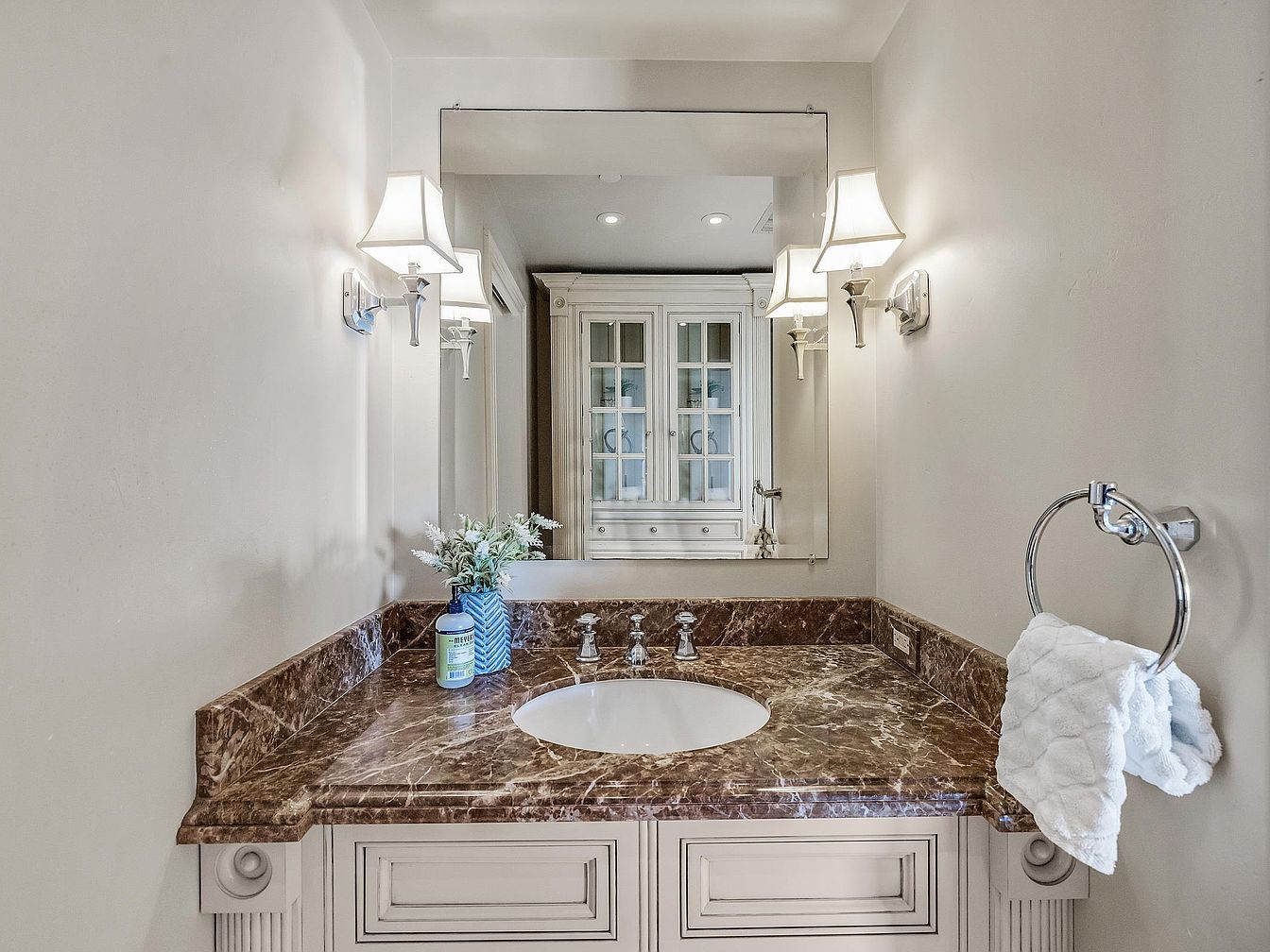An elegant and inviting bathroom vanity displays a rich brown marble countertop paired with a cream-colored, intricately paneled cabinet for a touch of traditional sophistication. Flanking the large frameless mirror, two classic sconces provide warm illumination, creating a cozy yet refined atmosphere. The neutral wall color enhances the sense of space and calm, while thoughtful touches like a towel ring with a plush white towel and a decorative vase with fresh greenery bring in a sense of hominess and comfort. This setup is perfect for families, offering a clean, organized, and welcoming spot for daily routines.