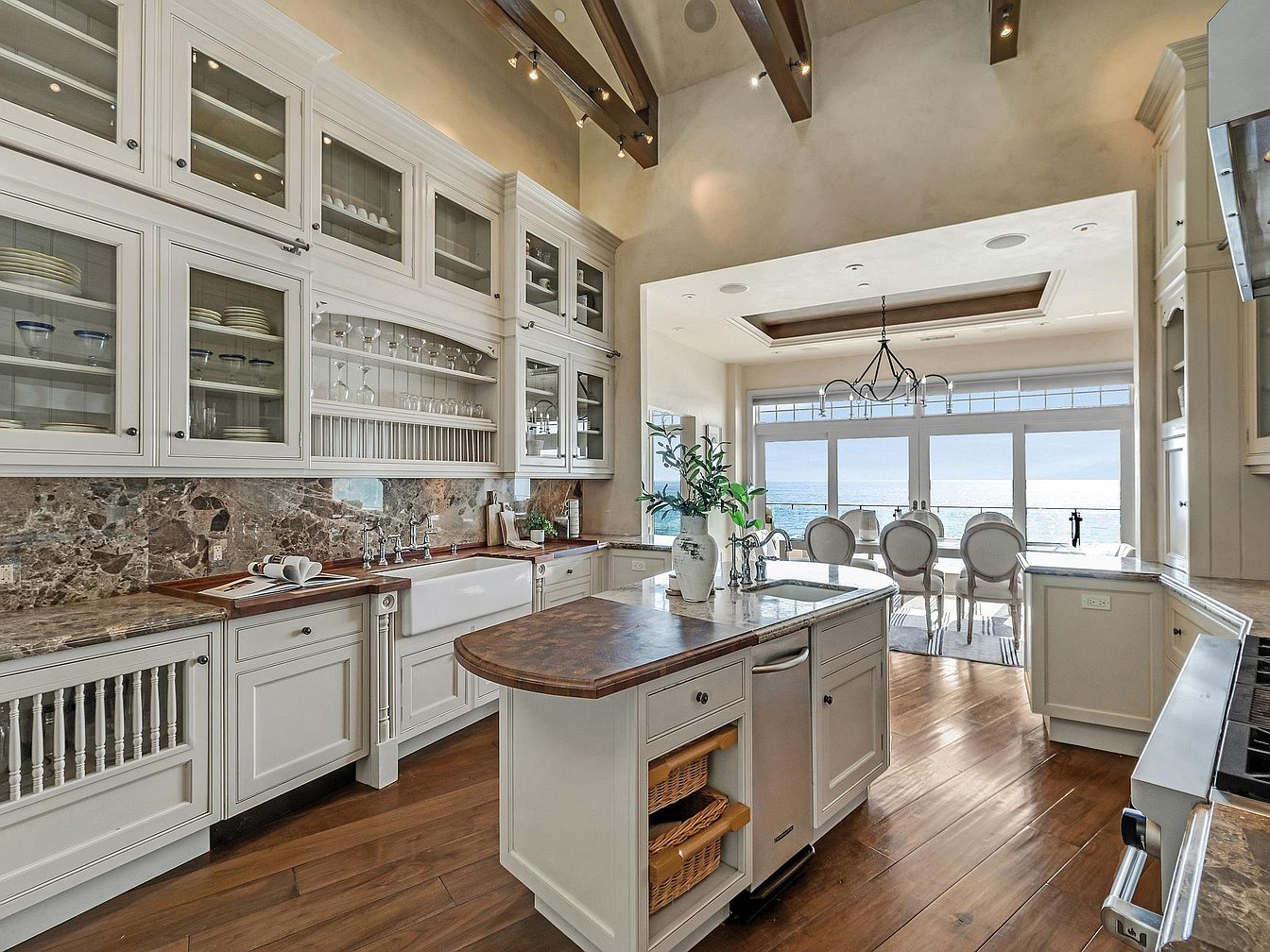 This stunning open-concept kitchen and dining area features elegant cream cabinetry with glass-panel doors, allowing for display of dishware and glassware, perfect for a growing family. Striking dark wood beams stretch across the high ceiling, creating a sense of spaciousness and warmth. The marble countertops and backsplash add sophistication, while the large farmhouse sink and central island with wooden accents provide practical, family-friendly utility. Ample natural light fills the space from the wall of windows and French doors, offering an unobstructed view of the water. The adjoining dining space seats six, inviting everyone to gather comfortably.
