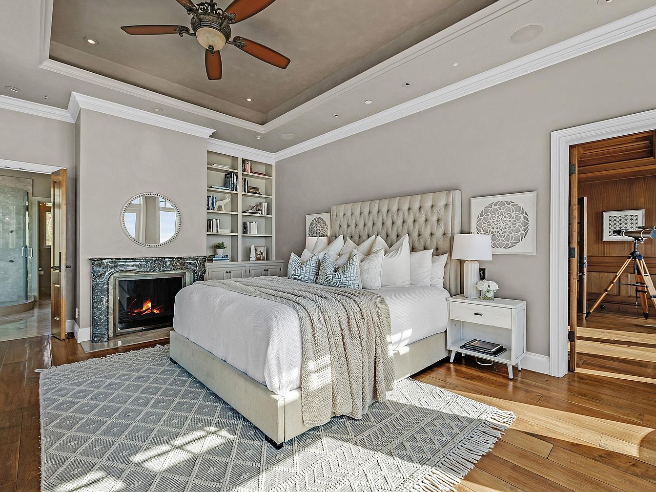 A serene and spacious master bedroom combines elegant comfort with timeless details. Soft, neutral tones of gray and ivory grace the walls and bedding, while a tufted headboard, plush bed linens, and layered pillows create a cozy atmosphere. The warm hardwood flooring is complemented by a large patterned area rug, enhancing the family-friendly appeal. Thoughtfully designed built-in shelving offers convenient storage and display space on either side of the fireplace, which adds warmth and charm. Tray ceilings, crown moulding, and ambient lighting elevate the sophisticated ambiance. An en-suite bathroom and adjacent room with a telescope promise both relaxation and adventure for all ages.