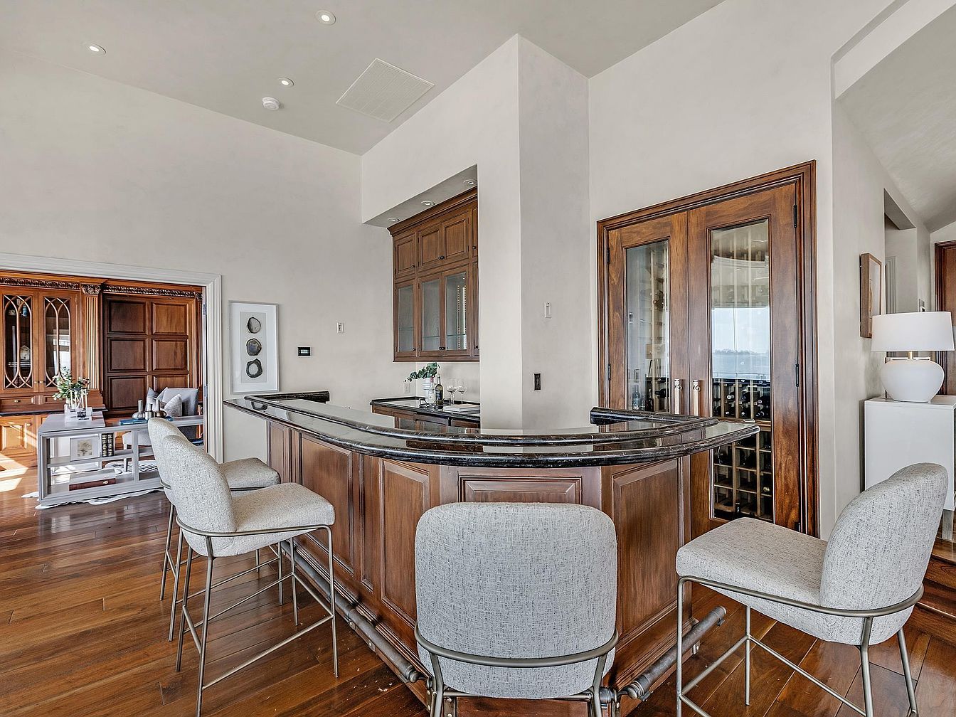 A sophisticated home bar with rich wooden cabinetry and a striking black granite countertop serves as the centerpiece of this inviting space. The bar is surrounded by modern, upholstered barstools with sleek metallic legs, offering comfortable seating for gatherings. Double glass doors reveal a well-organized wine cellar, adding both function and elegance. The warm wood tones of the floor and cabinetry contrast beautifully with the soft neutral walls and light-toned furniture, creating a harmonious and welcoming atmosphere. Adjacent sitting and dining spaces ensure this area is ideal for family entertaining and socializing alike.