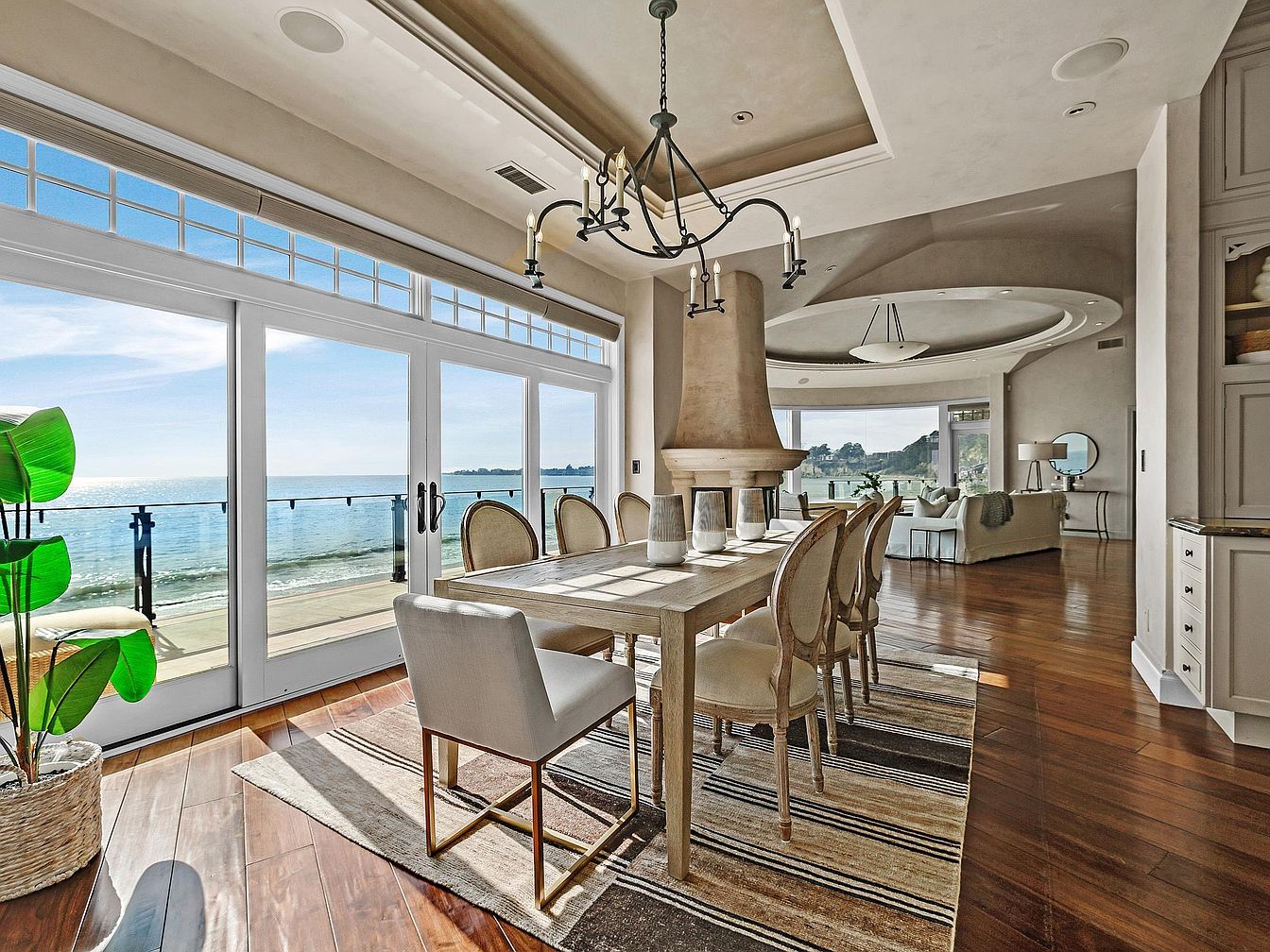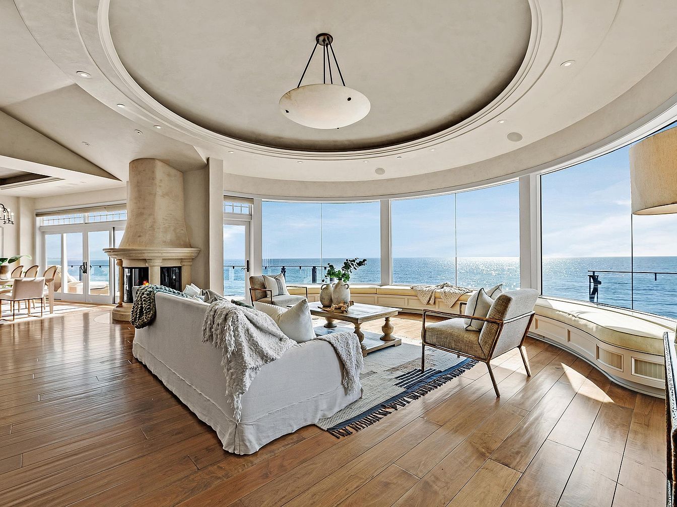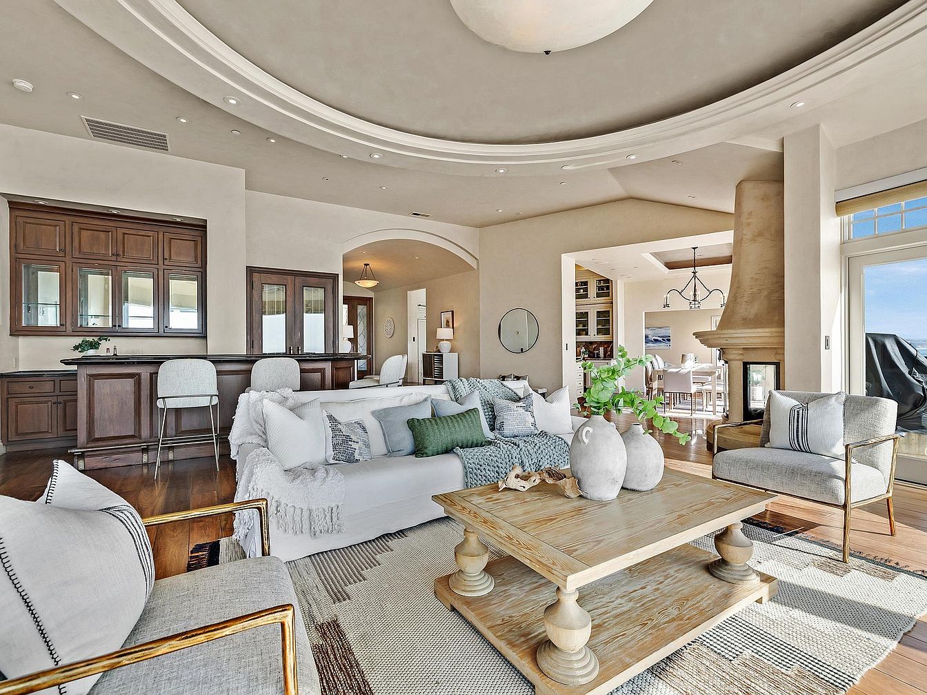 Spacious and light-filled, this living room features wall-to-wall windows offering stunning panoramic ocean views, filling the room with natural light. The circular architecture draws attention to the room’s centerpiece, a stylish chandelier and a contemporary stone fireplace, perfect for cozy family gatherings. Soft neutral tones in the furniture and cushioned window seating add warmth, while the wood floors provide a natural, inviting touch. The open layout seamlessly connects the living space to the dining area, creating a welcoming atmosphere suitable for large families or entertaining guests. Every detail exudes relaxed coastal elegance, making the space both sophisticated and family-friendly.