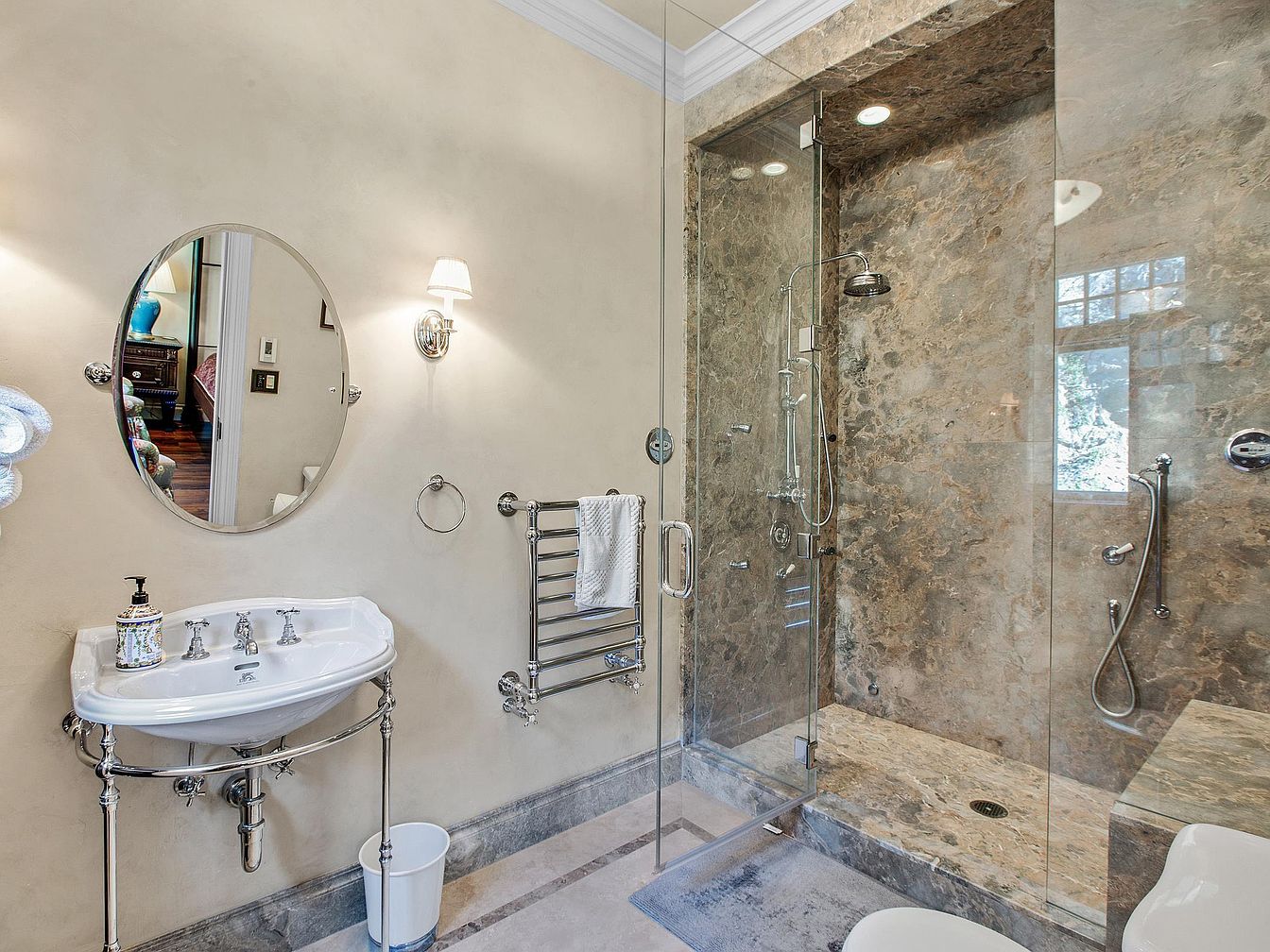 A spacious bathroom featuring a luxurious, glass-enclosed walk-in shower lined with rich marble for a refined and timeless look. The creamy, soft beige walls bring warmth while crown molding adds a classic architectural touch. A wall-mounted sink with polished chrome fixtures and a vintage-inspired oval mirror lends sophistication, complemented by a towel warmer for added comfort. Soft accent lighting above the sink and plenty of natural light from the window create a bright, inviting space. Family-friendly details include ample room for movement, durable finishes, and accessible fixtures, ensuring both elegance and everyday practicality.