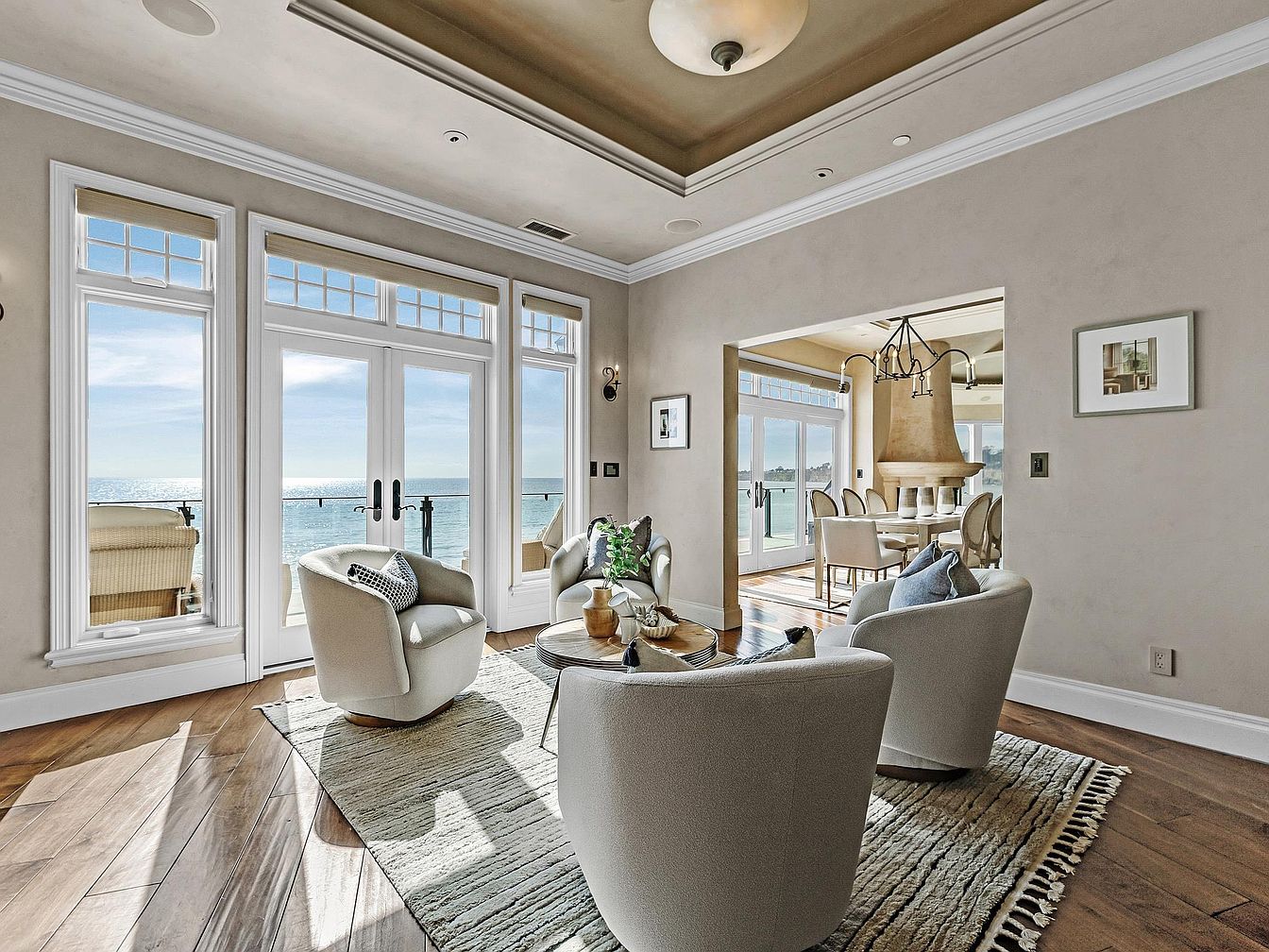 Bathed in natural light, this living room offers breathtaking ocean views through expansive French doors and tall windows, making it a perfect space for families to gather. The open layout provides seamless access to the adjacent dining area, enhancing the sense of spaciousness. Soft, neutral tones of beige and cream complement the warm wood flooring, while plush swivel chairs arranged around a textured area rug invite conversation and relaxation. Minimalist wall art and subtle decorative details create a sophisticated yet welcoming atmosphere, ideal for both daily living and entertaining. The space strikes a harmonious balance between comfort, luxury, and family-friendly practicality.
