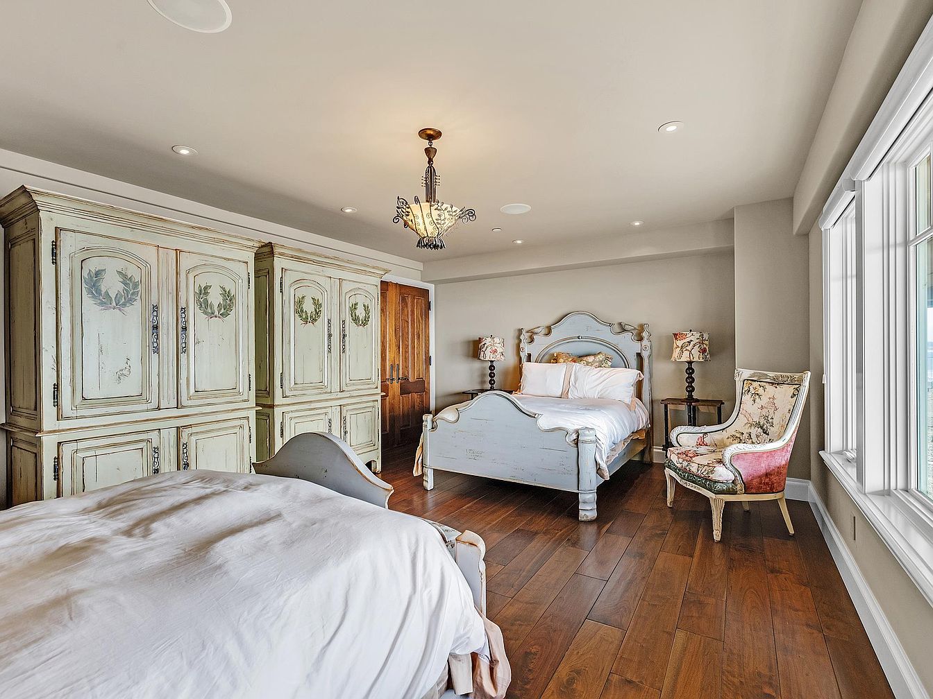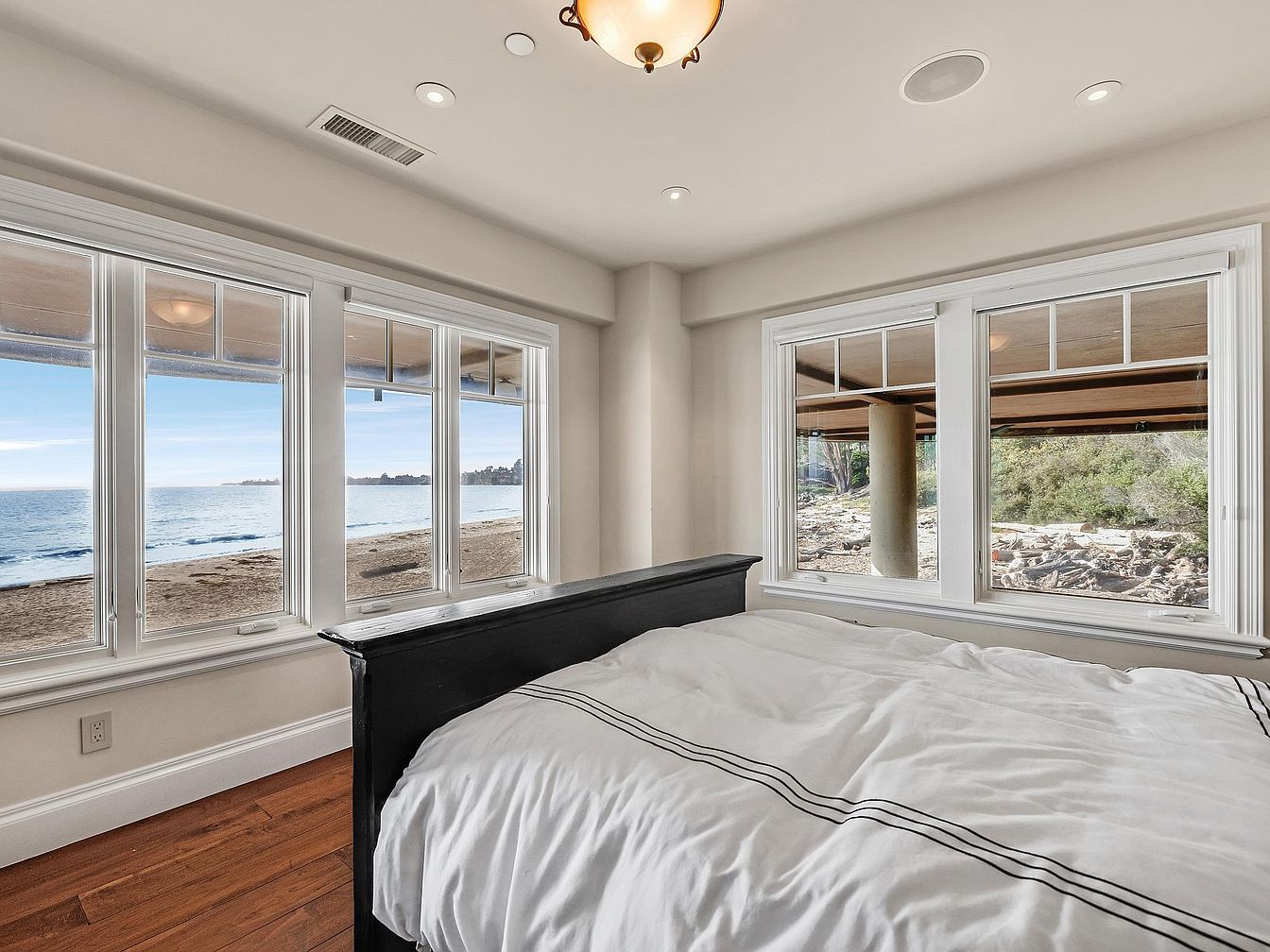 A bright and serene bedroom offers wall-to-wall windows overlooking a peaceful beach, seamlessly blending indoor comfort with breathtaking outdoor scenery. Natural light floods the space, highlighting warm hardwood floors and soft, neutral-toned walls that create a calm environment ideal for relaxation. The bed is positioned to maximize views of the ocean, making every morning feel like a retreat. Simple, elegant architectural touches—such as thick window trims and recessed lighting—contribute to a clean, timeless feel. This layout is perfect for families, providing a tranquil space to unwind together while being conveniently close to the natural beauty outside.