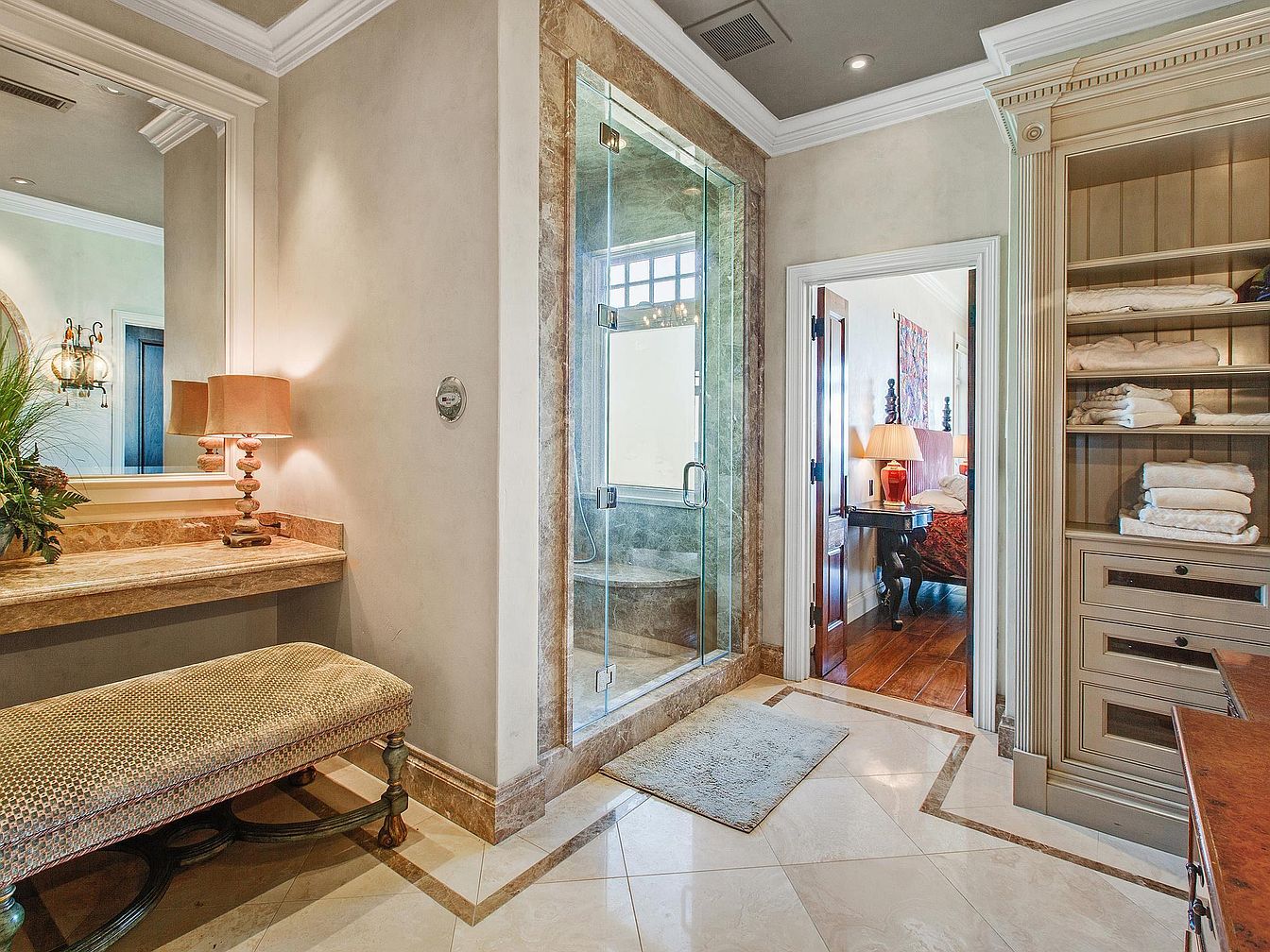 This luxurious master bathroom entry seamlessly combines elegance and comfort, offering a spa-like retreat ideal for family living. Creamy marble floors are framed with mosaic inlays, while a grand glass-enclosed shower with natural stone trim draws attention as a central feature. The built-in shelving is neatly stocked with fresh towels, emphasizing convenience and readiness for daily routines. A plush upholstered bench and marble vanity provide functional yet stylish seating and prep areas, paired with soft lighting from a sculptural lamp. Muted taupe and ivory tones, along with crown molding and tasteful greenery, create a soothing, timeless ambiance.