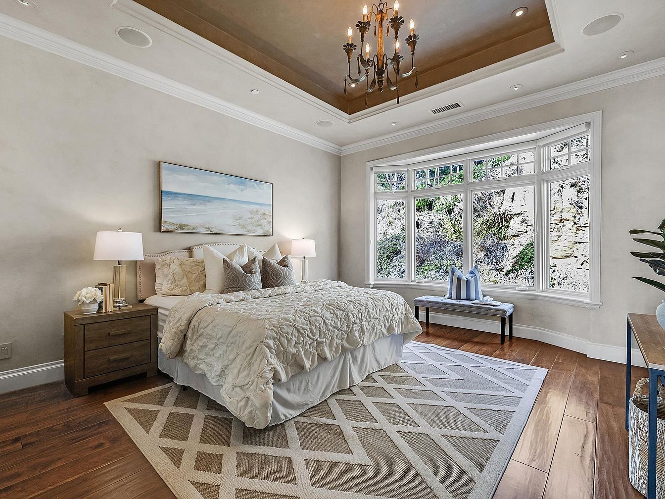 A spacious and inviting master bedroom featuring a soothing neutral color palette and abundant natural light from an expansive bay window. The plush bed, adorned with cozy textured linens and an array of decorative pillows, sits between two wooden nightstands topped with softly glowing lamps. A modern geometric area rug anchors the room atop polished wood floors, while a serene landscape painting adds tranquility above the bed. Elegant crown molding, recessed lighting, and a dramatic chandelier create a sense of sophistication. A cushioned bench with accent pillows beneath the window offers a charming reading nook, making this space both family friendly and relaxing.