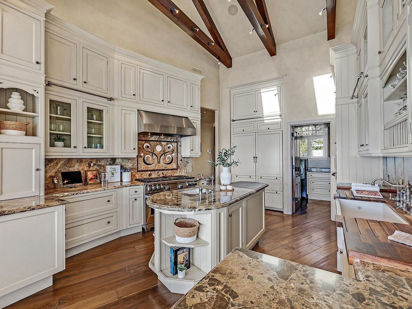 A spacious, light-filled kitchen features a large central island with a marble countertop, perfect for family meal prep or casual gatherings. The room balances elegance and function with cream-colored cabinetry, glass-front upper cabinets, and built-in shelving for extra storage. The rich, polished wood flooring and striking exposed ceiling beams add warmth and a sense of grandeur to the space. A farmhouse sink, professional-grade stove, and detailed stone backsplash combine timeless style with modern convenience. The thoughtful layout and abundant workspace make this kitchen ideal for family cooking, hosting friends, or spending time together.