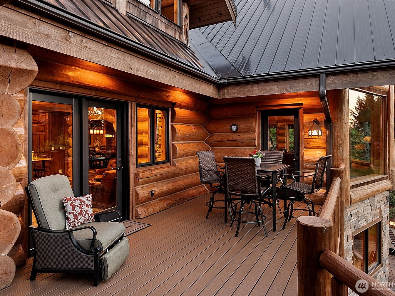 Warm timber walls and a dark metal roof frame this inviting log cabin deck, perfect for family gatherings and relaxation. Comfortable seating includes a plush armchair and a woven dining set, providing options for both lounging and dining al fresco. The spacious layout offers plenty of room for children to play safely, while the secure railings add peace of mind. Soft amber lighting complements the natural wood tones, creating a welcoming ambiance at any time of day. Large windows and glass doors effortlessly connect indoor spaces to the outdoors, making this a seamless extension of the family home.