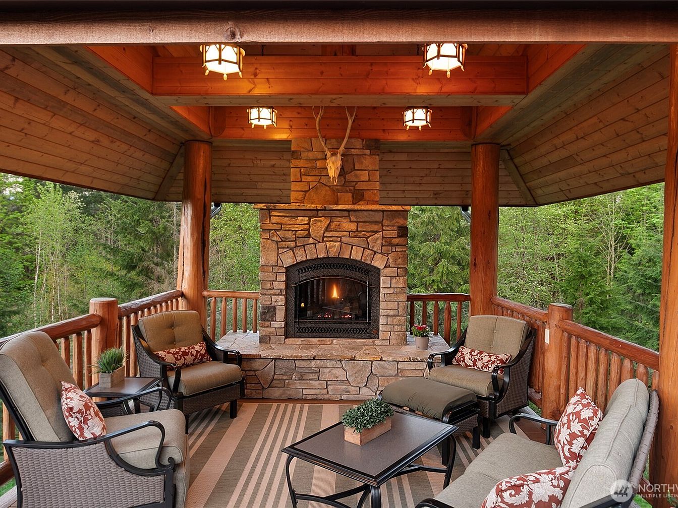 A welcoming outdoor covered patio offers the perfect retreat for both quiet relaxation and family gatherings. The space features a stunning stone fireplace as a focal point, surrounded by plush cushioned seating arranged to encourage conversation. Neutral-toned furnishings with decorative red and white accent pillows enhance the cozy, rustic ambiance. Exposed wooden beams and log railings frame the patio, blending harmoniously with the lush green forest backdrop. Overhead lantern-style lighting adds a warm glow for evening enjoyment, while a striped area rug ties the seating area together, making the space inviting and family-friendly for year-round outdoor living.