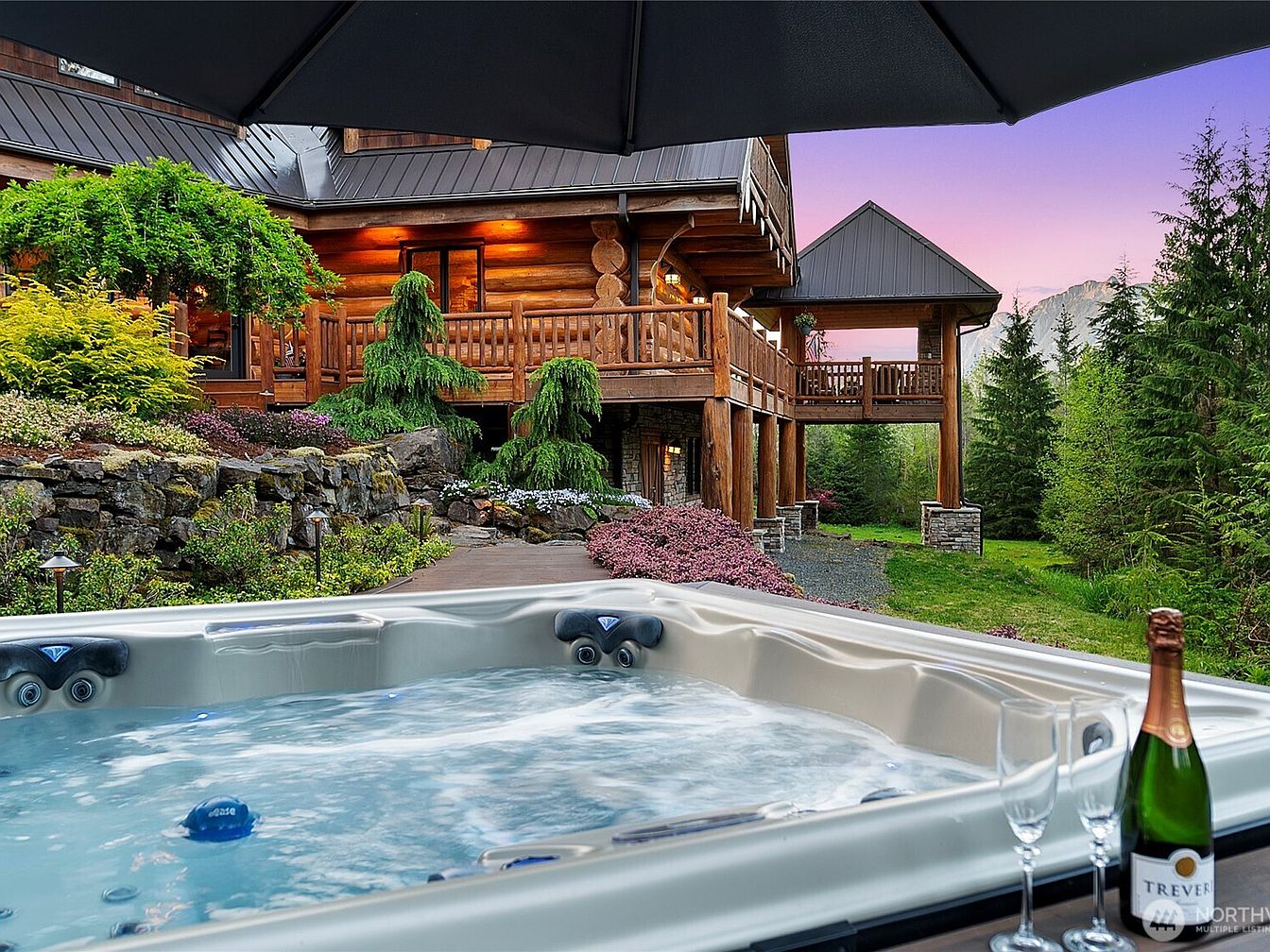 A luxurious outdoor hot tub sits at the heart of this rustic mountain home’s backyard, surrounded by beautifully landscaped rock gardens and lush greenery. The rich timber log architecture of the house radiates warmth, with glowing lights highlighting the spacious wrap-around deck perfect for gatherings. Mature evergreens and manicured shrubs create privacy and a sense of seclusion, making this an ideal family-friendly space for relaxation and play. Natural stone pathways wind through the garden, while a bottle of sparkling wine and flutes on the tub’s edge set the scene for lively evenings or tranquil unwinding. A true sanctuary for all ages.