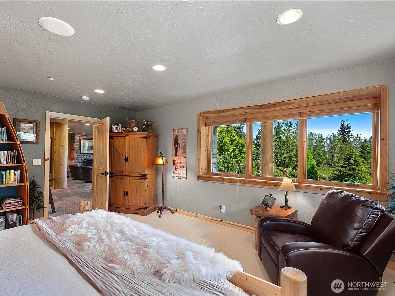 This cozy bedroom features a stunning triple-pane window with natural wood trim that frames a picturesque view of lush greenery, flooding the space with light and offering a tranquil retreat. The calming gray walls complement the plush neutral carpet and soft textures of the bed, layered with a tactile faux fur throw for warmth. A comfortable dark leather armchair is perfectly positioned for relaxation or reading, while rustic wooden furnishings, including a corner armoire and side table, highlight the room’s inviting character. Family-friendly details such as a bookshelf and durable finishes make this a welcoming and functional sanctuary for all ages.
