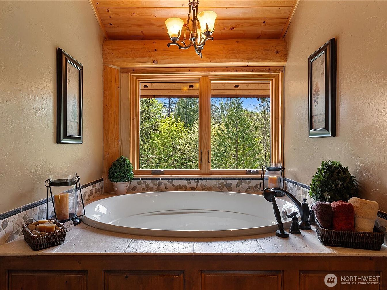 A tranquil soaking tub is set beneath a large picture window, inviting the outdoors in and offering a soothing view of lush greenery. Natural wood elements from the paneled ceiling and window frame pair perfectly with the earth-toned walls and mosaic tile surround, creating a cozy, rustic ambiance. Soft lighting from a charming fixture adds warmth and relaxation, while thoughtful touches like potted greenery, neatly rolled towels, and candles ensure a family-friendly, spa-like experience. The spacious ledge around the tub provides space for bath essentials, making it both practical for day-to-day use and a perfect spot for quiet relaxation.