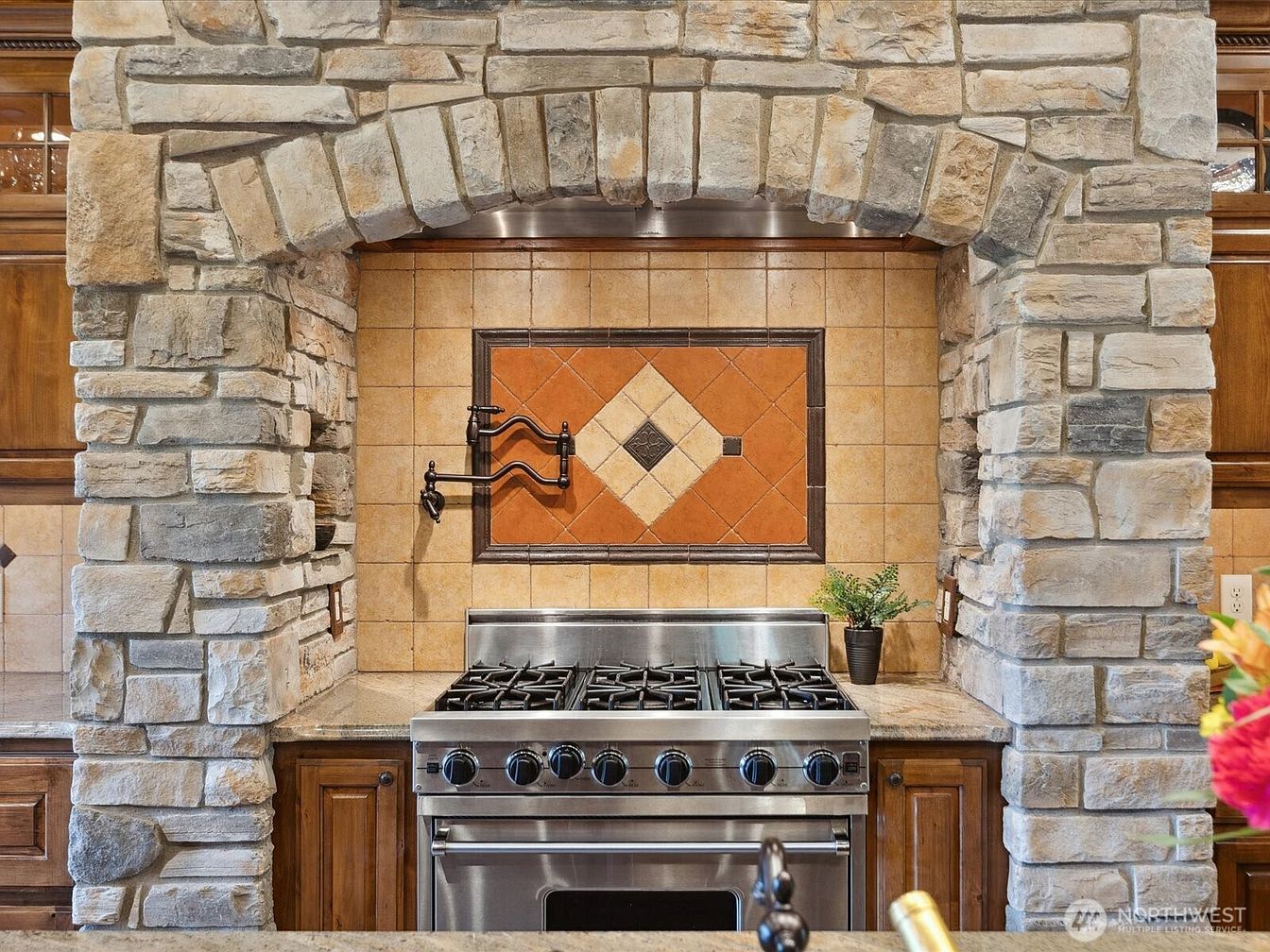 A stunning kitchen stove alcove features a rustic stone arch framing a high-end stainless steel gas range, creating a dramatic focal point. The surrounding cabinetry is crafted from rich wood, blending warmth with the textured stone for a cozy, inviting ambiance ideal for family gatherings. Neutral earth-toned tiles line the backsplash, accented with a decorative inlay of terra cotta and cream diamond patterns. A convenient pot-filler faucet is mounted beside a modest potted plant, adding practical elegance. The stonework and warm wood contribute to a classic, family-friendly atmosphere where cooking and conversation feel seamlessly woven together.