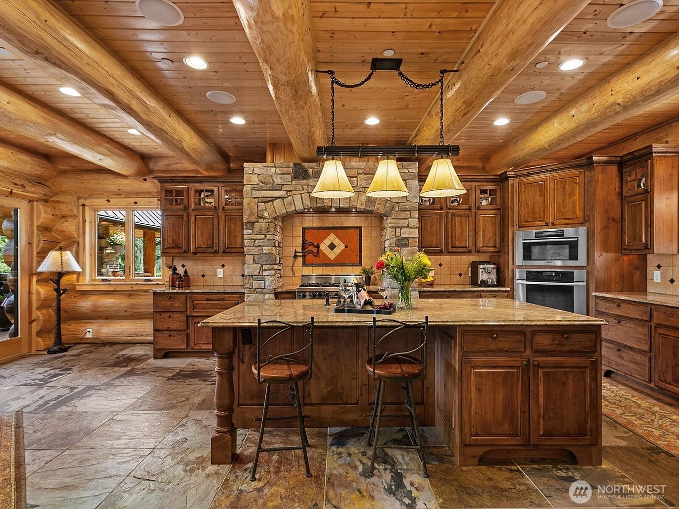 Warmth and character define this spacious log cabin kitchen, featuring an expansive stone-topped island at the center, perfect for family gatherings or casual meals. Dramatic exposed wood beams and golden log walls frame an inviting setting, while the stonework around the stove enhances the rustic charm. Ample wooden cabinetry, stylish pendant lighting, and dual built-in ovens combine practicality with traditional craftsmanship. Large windows allow natural light to spill across slate floors, making the space bright and welcoming. The generous countertop space and thoughtful layout offer family-friendly cooking, baking, and entertaining, making it truly the heart of the home.
