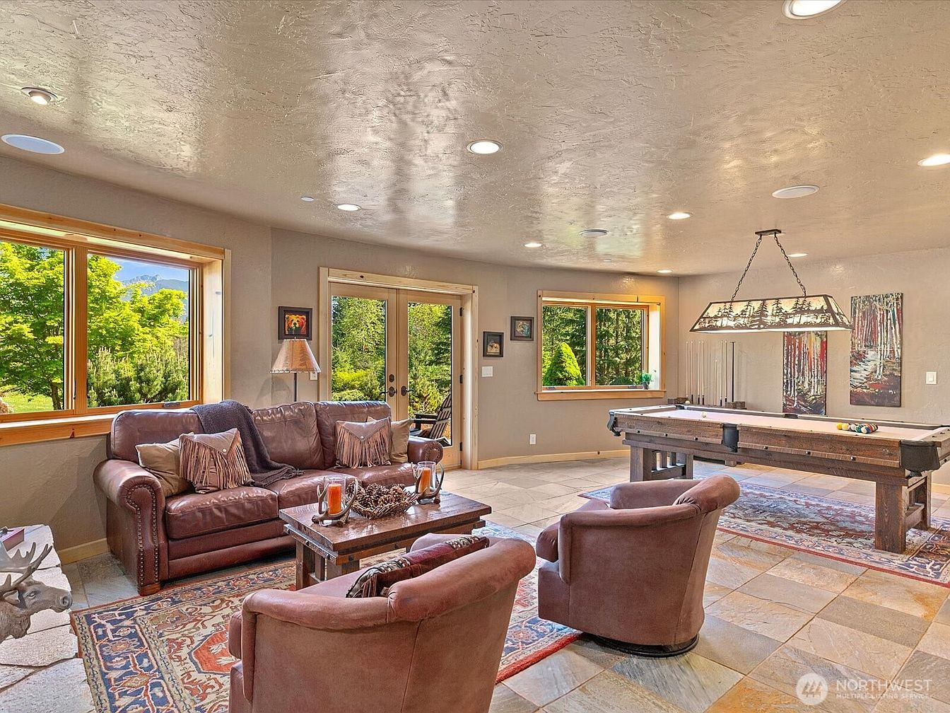 A spacious game room invites gatherings with plush leather sofas and matching armchairs, arranged around a rustic wood coffee table for cozy conversation. The stone-tiled floor is layered with Persian-style rugs, blending warmth and durability. Large windows and glass doors bring in abundant natural light and provide tranquil views of the surrounding greenery, creating an indoor-outdoor feel. A central billiards table, illuminated by a woodsy-themed pendant light, promises hours of family entertainment. Soft neutral walls and wood trim add an inviting, earthy charm, while tasteful nature-inspired artwork completes this comfortable, family-centric space designed for relaxation and play.
