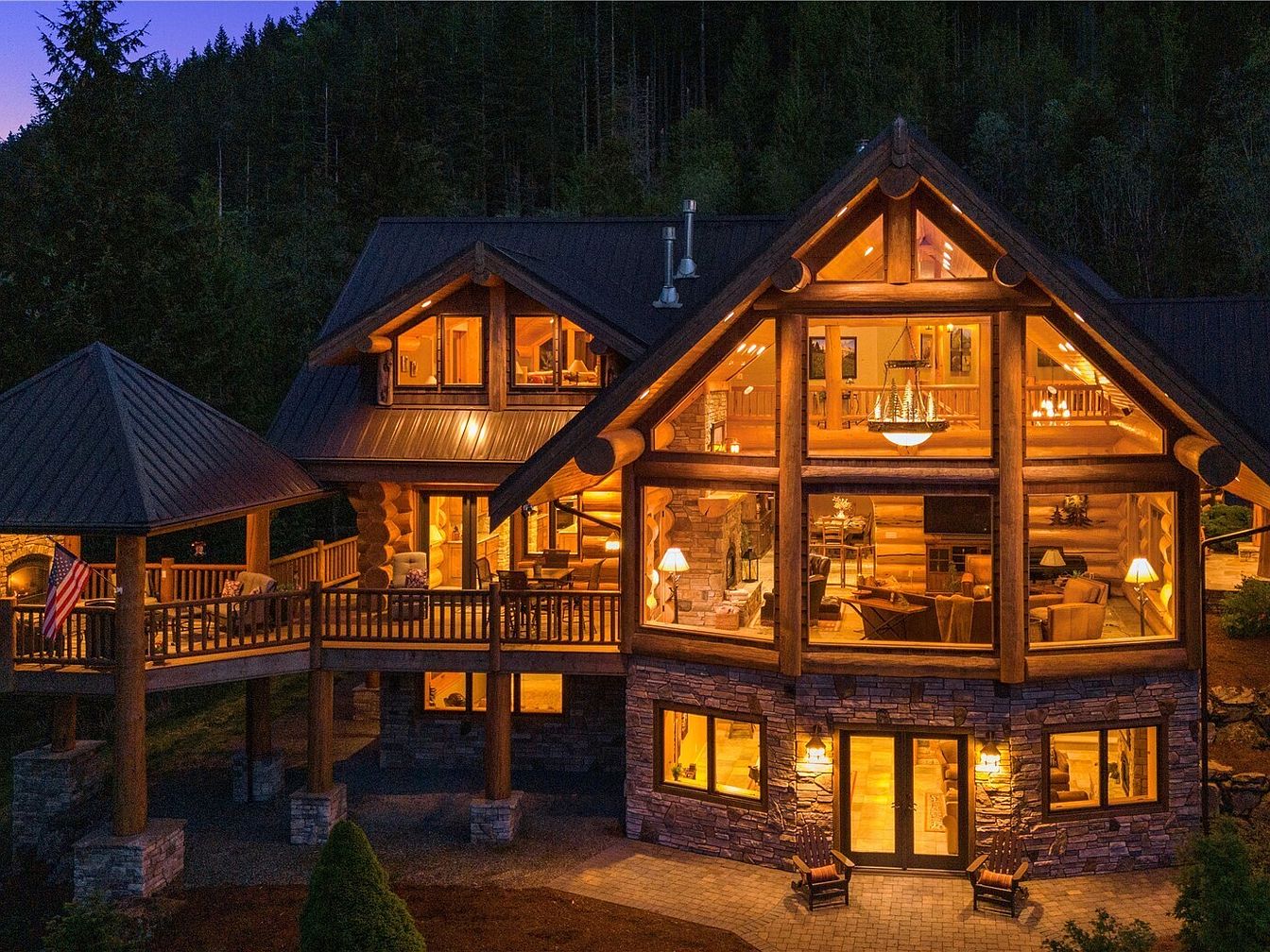 A stunning log cabin-style home beautifully illuminated at dusk with warm, inviting lights radiating from the expansive great room. The architecture features a blend of stone and solid timber, highlighted by soaring cathedral ceilings and dramatic floor-to-ceiling windows that reveal a spacious living area. Cozy seating arrangements, rustic wooden beams, and an impressive stone fireplace create a family-friendly environment ideal for gatherings. The surrounding wraparound deck and covered outdoor patio extend the living space, providing ample room for entertaining. Natural wood tones, earth-toned stonework, and soft amber lighting enhance the mountain retreat ambiance while maintaining a sense of comfort and tranquility.