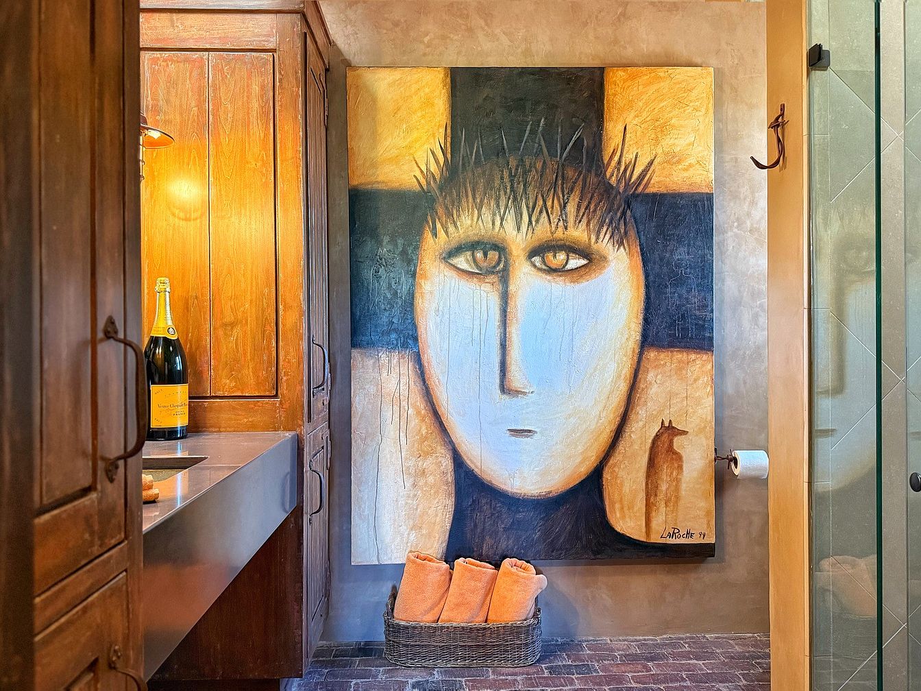 Warm wooden cabinetry sets an inviting tone as you step into this uniquely designed bathroom space. The standout feature is a large, expressive modern painting in bold ochre, black, and cream tones, lending a touch of artistic flair and personality to the room. Brick flooring adds rustic texture, while a glass shower enclosure offers a sleek contrast. A countertop displays a celebratory bottle, hinting at the room’s playful sophistication. Family friendly touches include neatly rolled towels in a basket and practical storage solutions, all in harmonious earthy hues that create a cozy and welcoming retreat for both residents and guests.