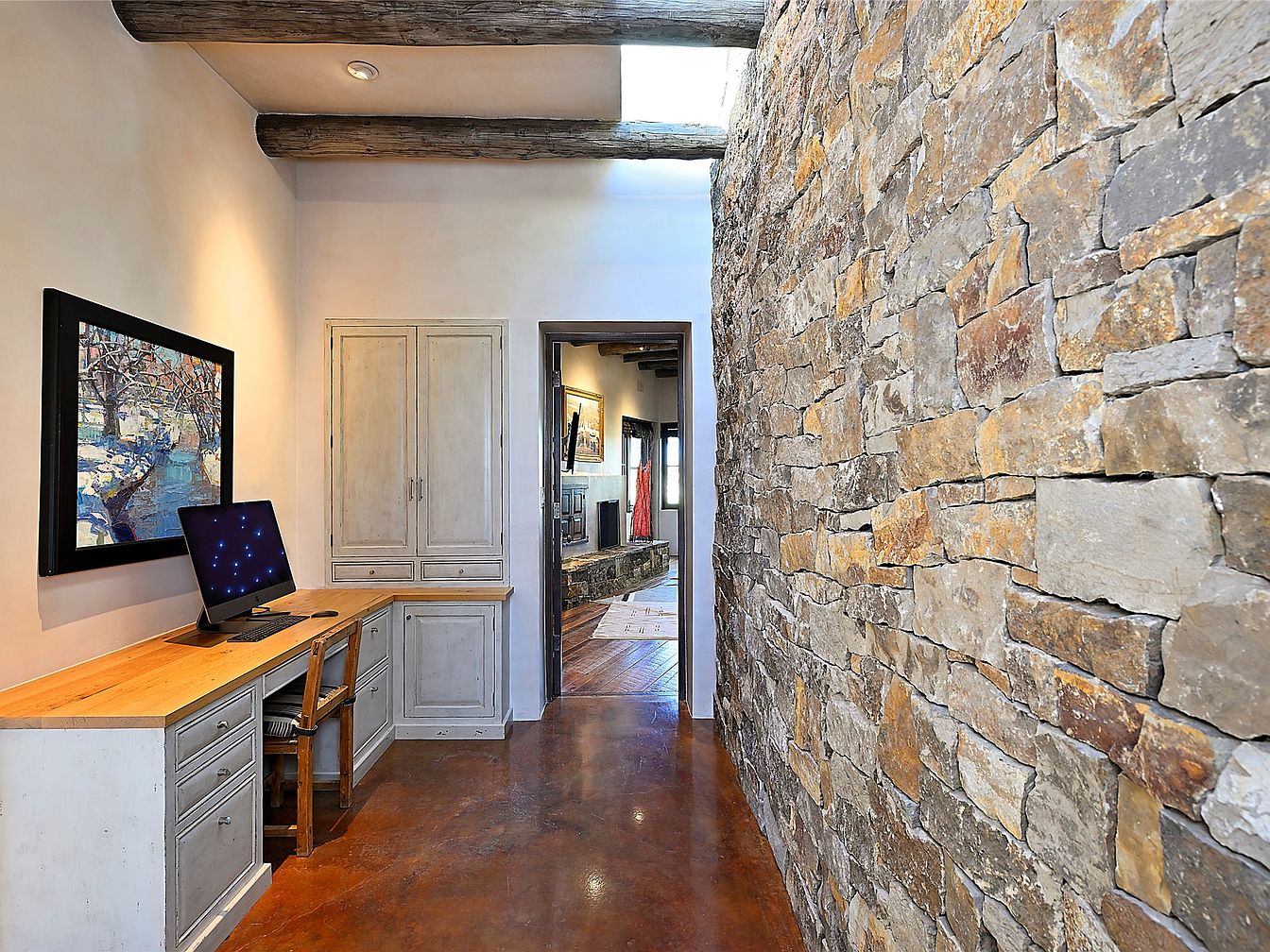 An inviting hallway featuring a charming built-in workspace with a reclaimed wood desk and storage cabinets, providing a functional family-friendly area for work or study. The space is defined by its striking architectural details including exposed log ceiling beams, a rustic stone accent wall, and rich, polished concrete floors. Muted, earthy tones throughout the cabinetry and stonework deliver a warm, Southwestern-inspired aesthetic. Natural light from a skylight enhances the cozy yet practical atmosphere. A framed nature painting above the desk adds a personal touch, creating an inspiring corner that blends seamlessly with the rest of the home’s open layout.