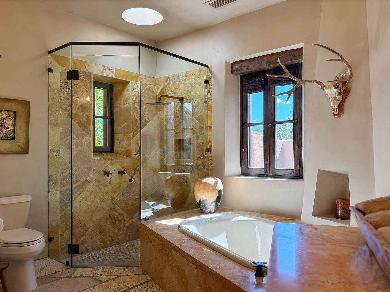 Warm natural stone tiles line the spacious walk-in shower and tub surround, creating a spa-like ambiance. The glass shower enclosure keeps the room open and is complemented by a small window that brings in natural light. The large soaking tub sits beneath a rustic wooden window, perfect for relaxing while enjoying outdoor views. Earthy beige walls, stone countertops, and Southwestern décor, including a mounted antler piece, blend comfort and cultured elegance. The layout provides easy access for families, with ample space for children and adults alike. Thoughtful accents, like a built-in shelf and decorative art, complete the inviting atmosphere.
