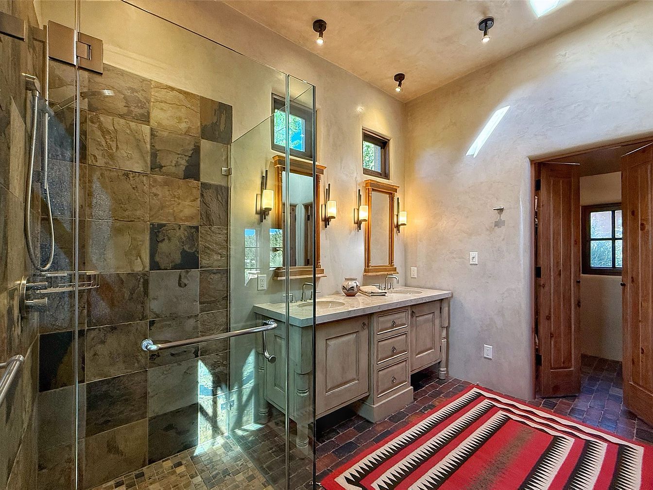 Warm southwestern charm infuses this spacious bathroom, featuring a walk-in shower accented by earth-toned stone tiles and a frameless glass door for a modern touch. The double-sink vanity is crafted from natural wood with weathered finishes, crowned by gold-framed mirrors and simple sconces that provide inviting ambiance. Terracotta brick floors extend across the room, layered with a vibrant geometric-patterned rug for color and comfort. Soft beige stucco walls lend a serene atmosphere, enhanced by natural light from skylights and windows. Family-friendly elements include ample counter space and easy-clean surfaces, all within an open, accessible layout.