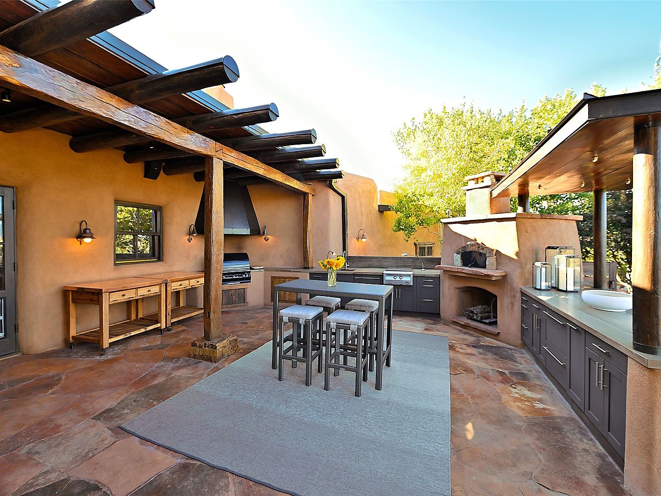 This inviting outdoor kitchen patio blends rustic charm with modern comforts, perfect for family gatherings or entertaining guests. Natural stone flooring complements warm adobe-style walls and exposed wooden beams, creating a cozy Southwestern ambiance. The open layout features a built-in grill, ample counter space, and a wood-burning fireplace for year-round enjoyment. Comfortable bar seating surrounds a central island, enhancing conversation and togetherness. Subtle lighting, sturdy cabinetry, and practical work surfaces cater to both chefs and children, while durable furnishings and an outdoor rug add comfort. Surrounded by lush greenery, this space encourages relaxed, family-friendly living and casual dining under the sky.