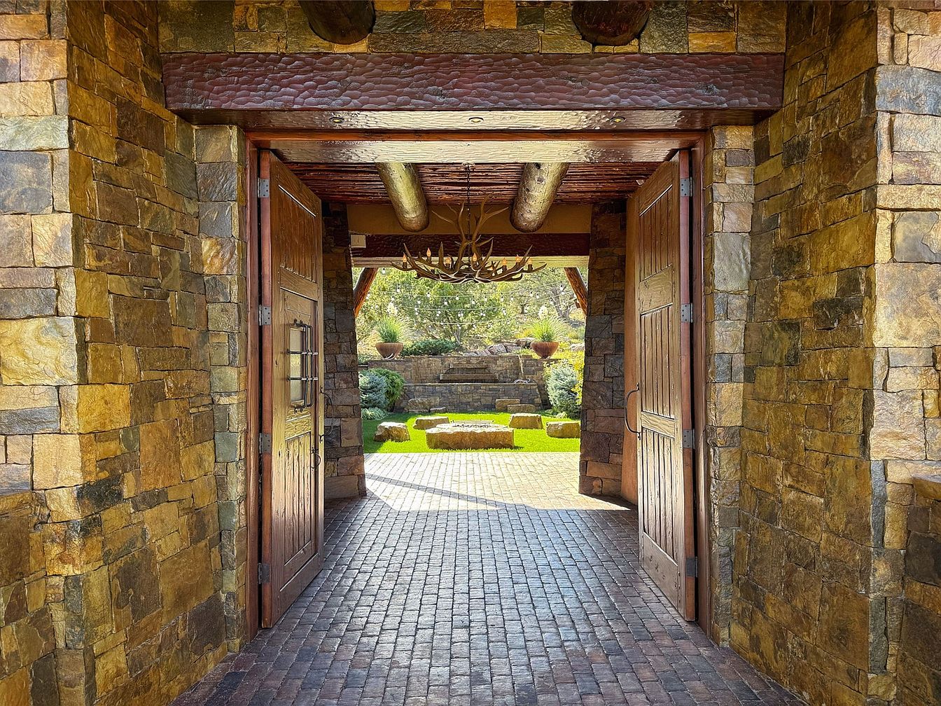 A welcoming entranceway with sturdy stone walls and wide double wooden doors offers an inviting first impression. The rustic, earthy color palette pairs beautifully with the textured stonework and exposed wood beams, creating a warm, nature-inspired aesthetic. The open doors reveal a sunlit courtyard beyond, featuring lush greenery and well-manicured landscaping, ideal for family gatherings or kids to play outside safely. Overhead, a unique antler chandelier adds an elegant touch, while the brick-paved floor is both practical and attractive, making the space as functional as it is inviting for guests and residents alike.