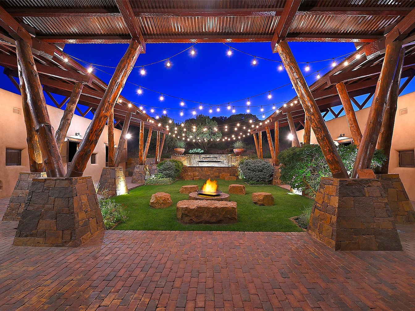 A welcoming courtyard combines rustic and modern elements, with impressive log beams set atop stone bases framing the space. Warm brick flooring transitions to a lush, green central lawn where a circular fire pit surrounded by stone seats invites gatherings. Overhead string lights create a magical evening ambiance, perfect for family get-togethers or entertaining friends year-round. Natural landscaping with shrubs and decorative planters lines the perimeter, while stucco walls and wooden details evoke Southwestern style. The open yet sheltered layout ensures safety for children to play, while adults relax and enjoy al fresco evenings amid a serene, inviting atmosphere.