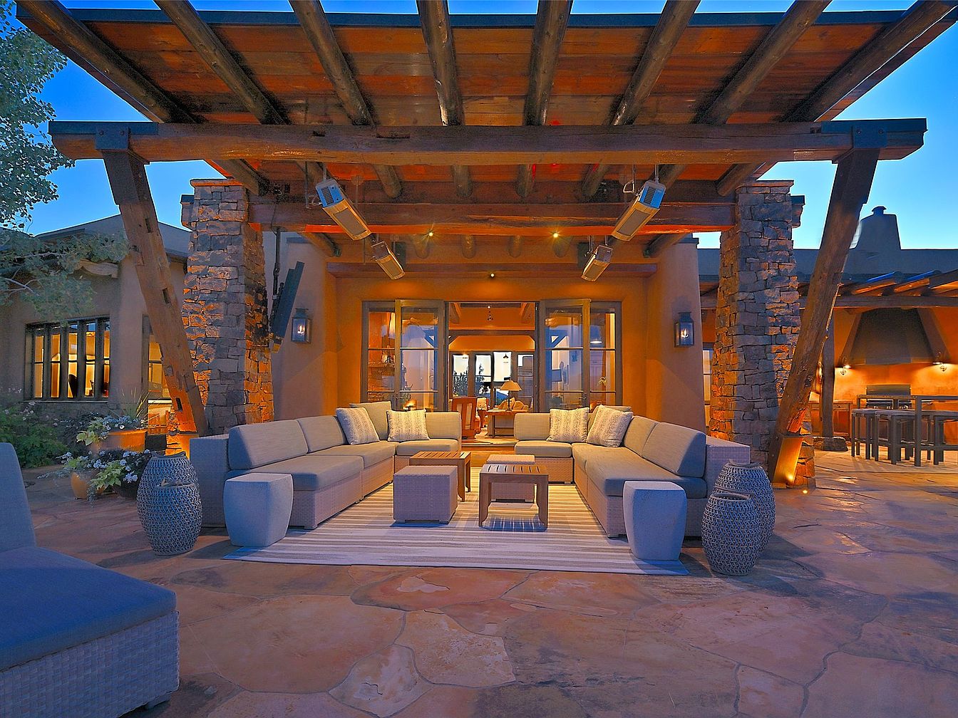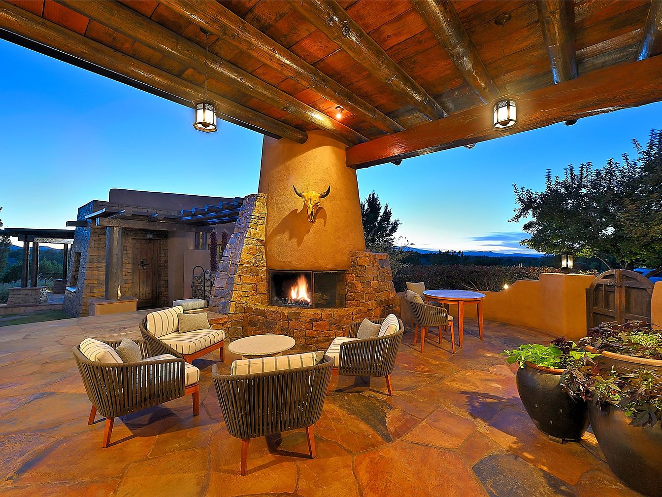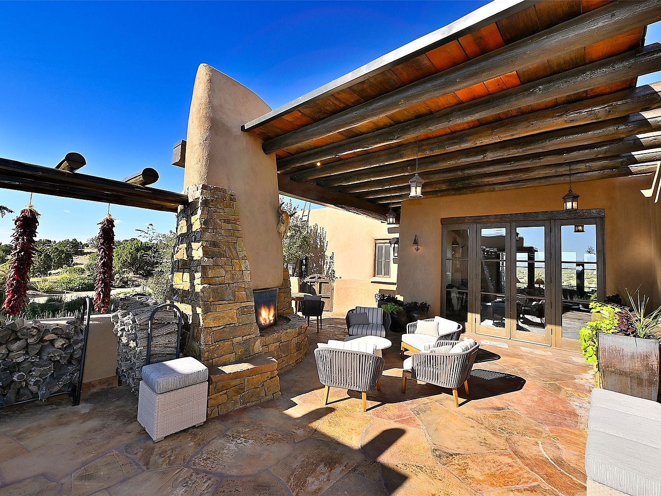 This inviting patio showcases an earthy, Southwestern aesthetic, perfect for family gatherings and outdoor relaxation. The space features a striking stone fireplace as a focal point, encircled by cozy wicker armchairs and ottomans that invite conversation and togetherness. Sturdy wooden beams line the pergola overhead, providing shade while maintaining a warm, rustic charm. Natural stone flooring complements the beige stucco walls, blending harmoniously with the surrounding landscape. Thoughtful touches like hanging chili ristras and lush potted plants add warmth and a sense of local culture. Large glass doors connect seamlessly to the interior, making this space ideal for enjoying both indoor and outdoor living.
