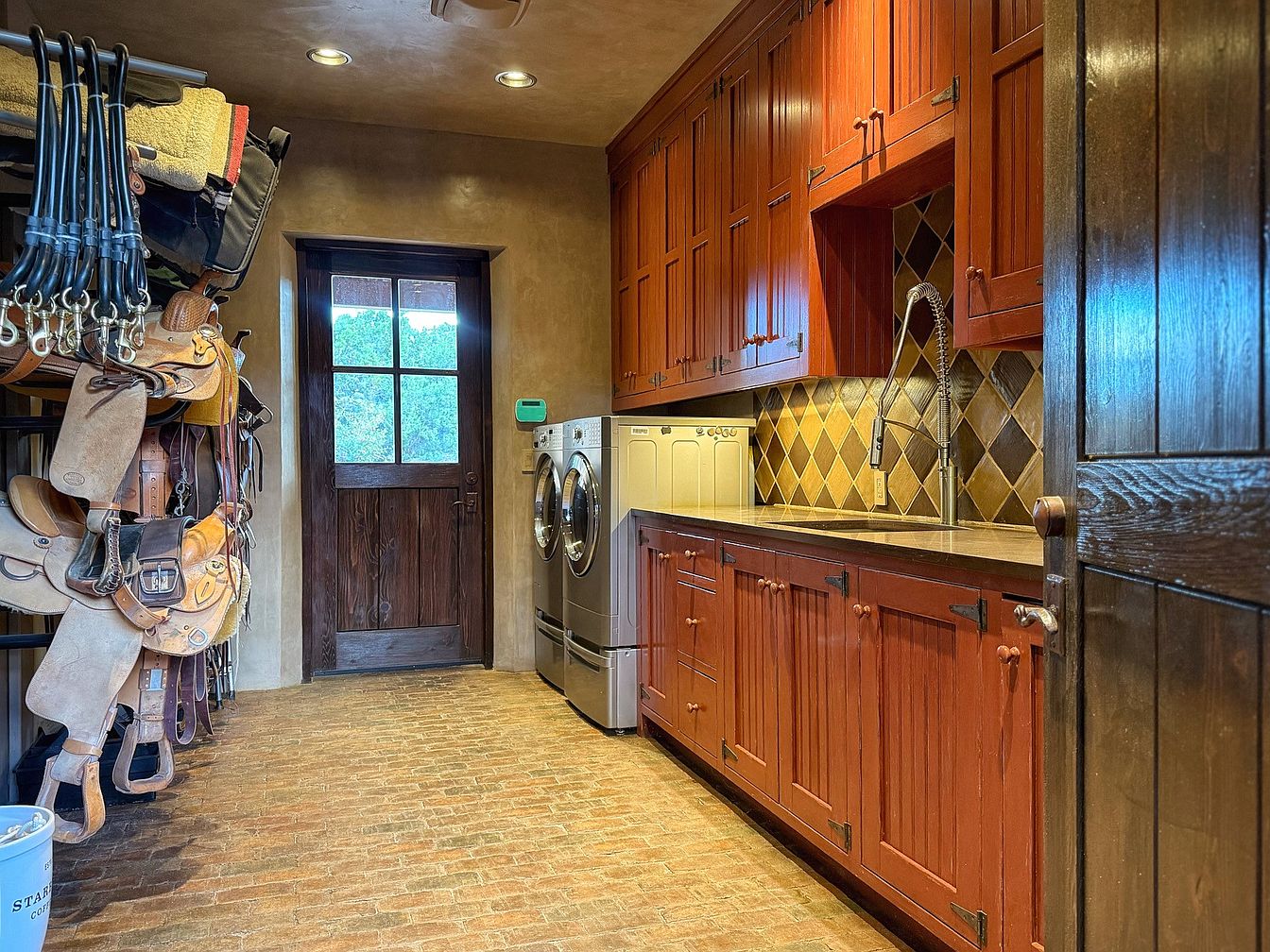 A welcoming mudroom and laundry area combines rustic charm with practical family features. Ample red wooden cabinetry lines one wall, providing generous storage above and below lengthy countertops. Warm, earth-toned tile backsplash complements the rich cabinetry and brick flooring, adding texture and coziness to the space. Stainless steel laundry appliances offer modern convenience, while the deep farmhouse-style sink and flexible faucet are ideal for handling any mess. Saddles and equestrian gear are neatly organized on sturdy racks, making this space especially functional for an active family. A wooden door with glass panes brings in natural light, creating a bright and inviting transition area for any home.