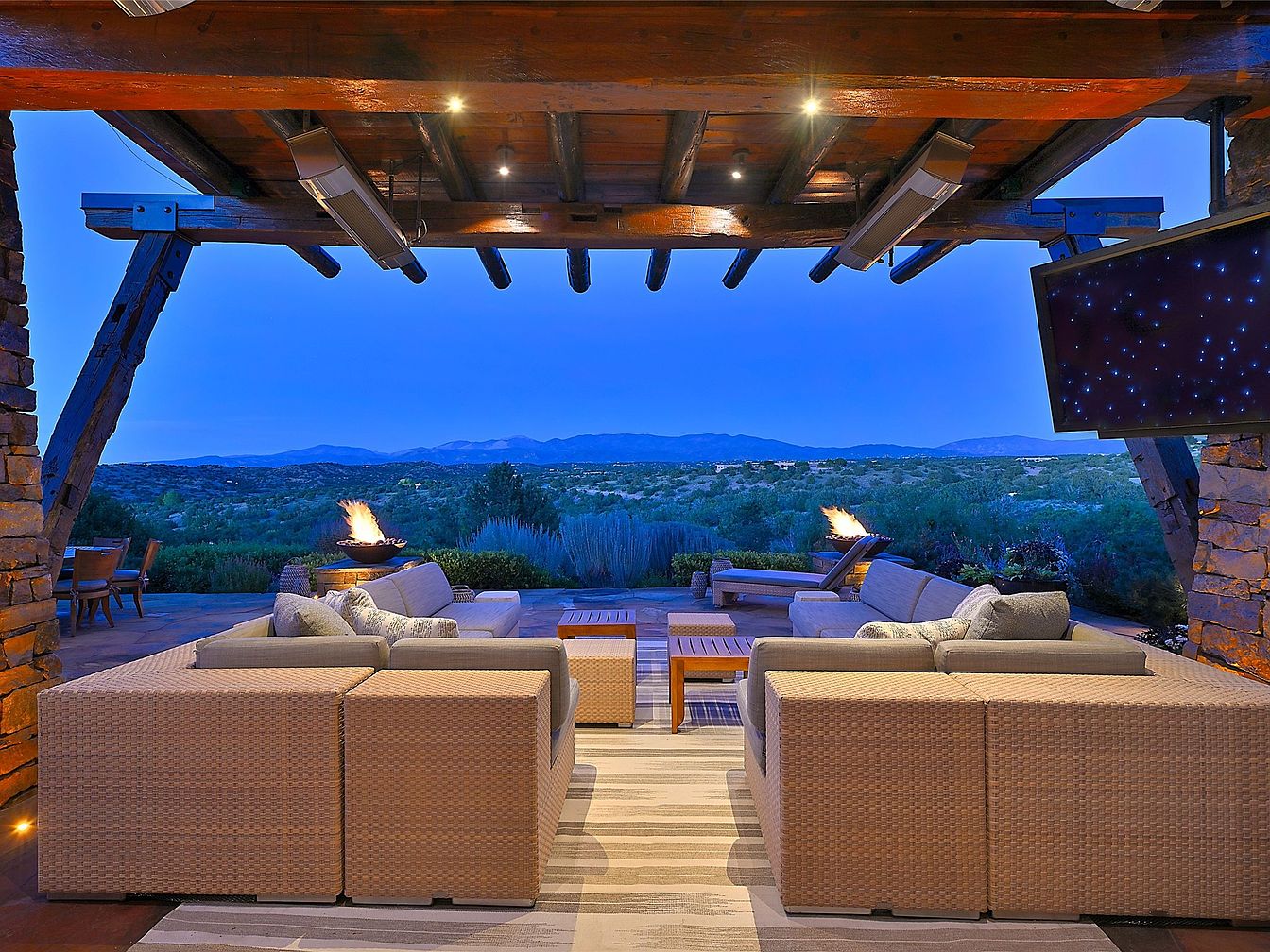An expansive outdoor lounge area blends comfort and style, designed for relaxation and family gatherings. Cozy sectional sofas, crafted from woven rattan with soft neutral cushions, form an inviting conversation space centered around a wooden coffee table atop a contemporary striped outdoor rug. Accented with glowing fire bowls and subtle recessed lighting overhead, the ambiance is perfect for evening entertaining. Natural stone pillars and exposed timber beams frame the space while drawing attention to the stunning panoramic mountain views. Nearby, a dining set and mounted television make this area ideal for both casual meals and movie nights under the stars.