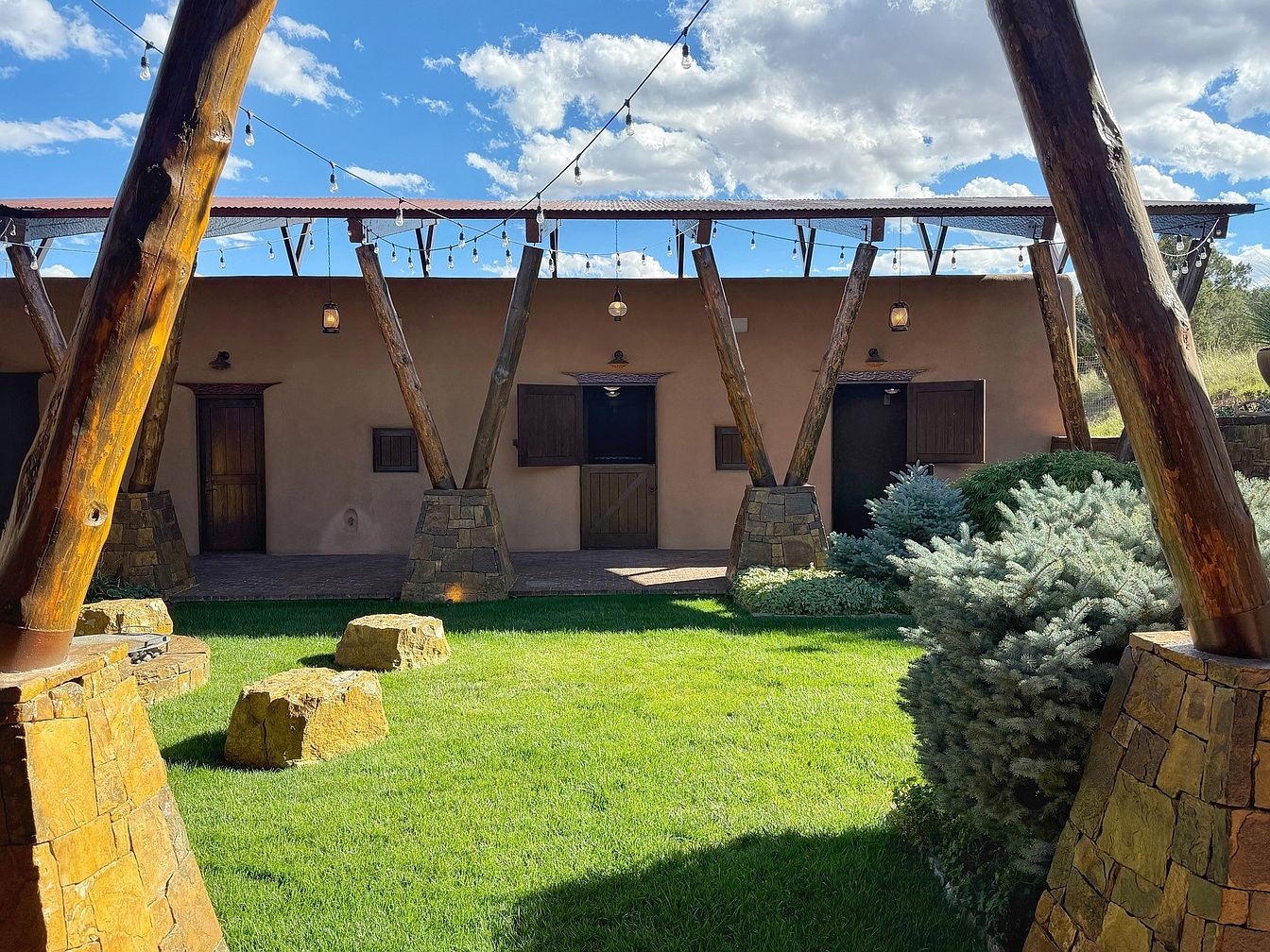 This backyard patio area features a lush, green lawn framed by mature shrubbery and stone landscaping. Thick timber posts with stone bases form a rustic yet welcoming colonnade supporting a covered walkway, providing both shade and architectural interest. String lights hang overhead, adding a magical touch for evening gatherings. The exterior walls of the house are finished in warm earth tones, with wooden doors and shuttered windows that echo traditional Southwestern design. The large stones scattered across the lawn offer informal seating, making it an inviting family-friendly space for play, relaxation, or entertaining guests outdoors.
