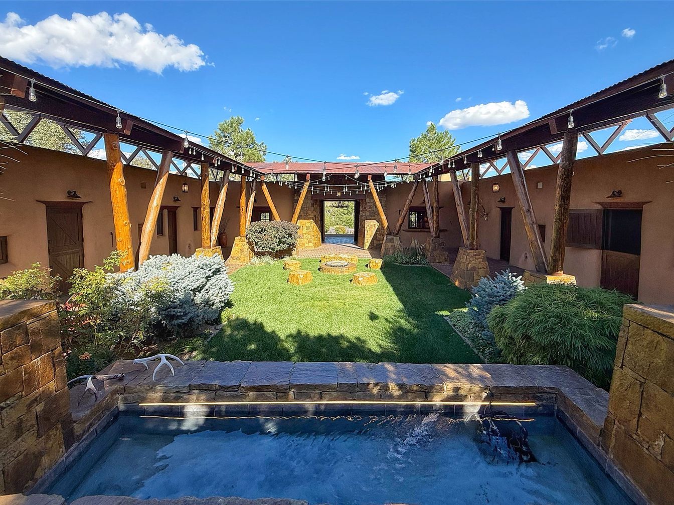 A serene courtyard embraces the home in a warm, welcoming layout, with adobe-style walls and exposed timber posts creating a rustic Southwestern charm. The L-shaped design encloses a grassy lawn, perfect for children to play or family gatherings on sunny days. Thoughtfully manicured shrubs and stone accents add texture and color, seamlessly blending with natural surroundings. Light string bulbs overhead lend a festive, cozy ambiance for evening relaxation. A small water feature or hot tub, built from stone, provides a focal point—ideal for unwinding or hosting guests. Wide pathways and multiple doors offer easy access, enhancing the space’s functionality for families.