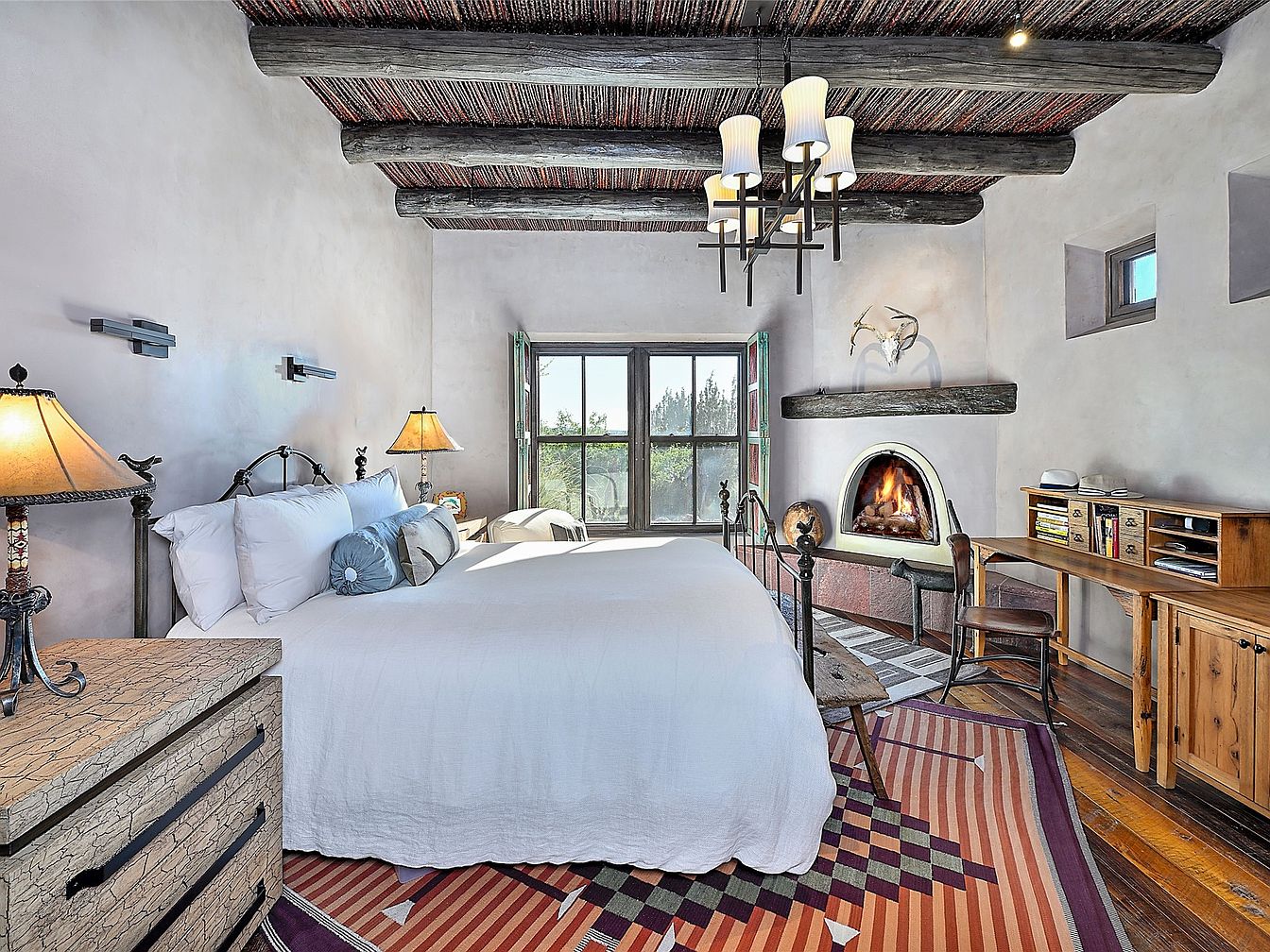 A spacious and inviting bedroom blends traditional Southwestern influences with comfort and functionality. Exposed timber beams and a woven ceiling create warmth overhead, while textured plaster walls add earthy elegance. The room features a large iron-framed bed dressed in crisp white linens with soft blue accent pillows, enhancing a tranquil feel. A classic kiva fireplace adds both visual interest and cozy ambiance, perfect for family gatherings or quiet evenings. A warm-toned wooden desk provides a dedicated workspace overlooking the landscape, complemented by a vintage dresser and coordinated side tables. The handwoven area rug and soft lighting further elevate this family-friendly haven.