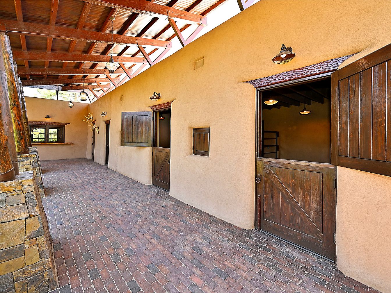 A bright and inviting stable walkway features exposed timber trusses and a translucent roof that allows abundant natural light to filter through. The cobblestone flooring is both durable and easy to clean, ideal for families with children who love animals. Warm tan stucco walls complement rustic wooden stall doors and wrought iron lanterns, creating a welcoming, Southwestern-inspired aesthetic. The layout is spacious and practical, offering easy access to each stall, while stone accents and thoughtful window placement add architectural charm. This area’s design balances practicality with comfort, perfect for family members to gather, care for horses, or simply enjoy the unique ambiance.