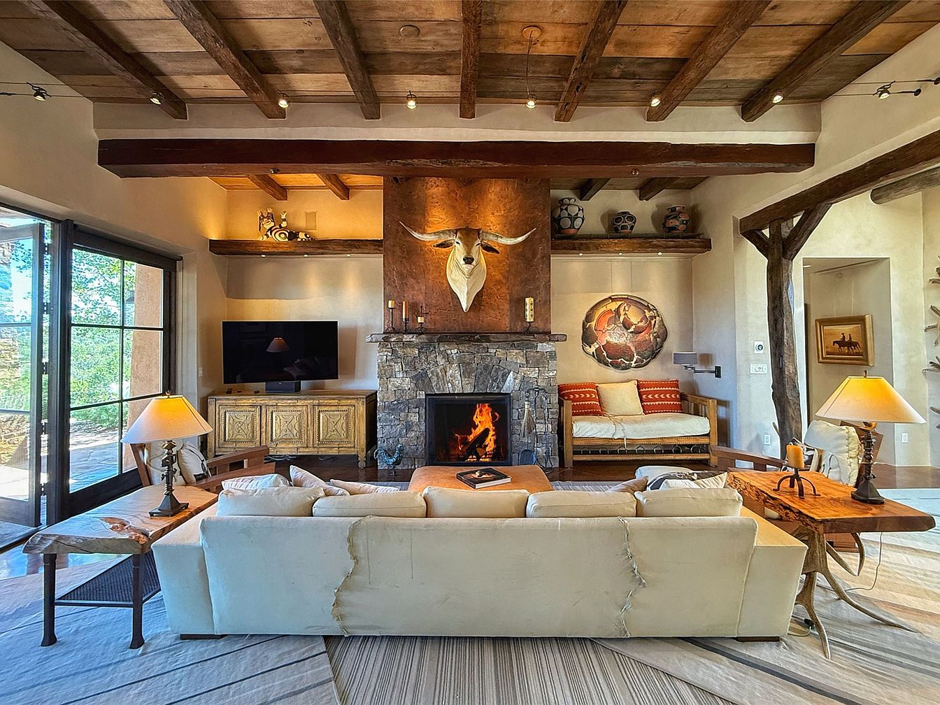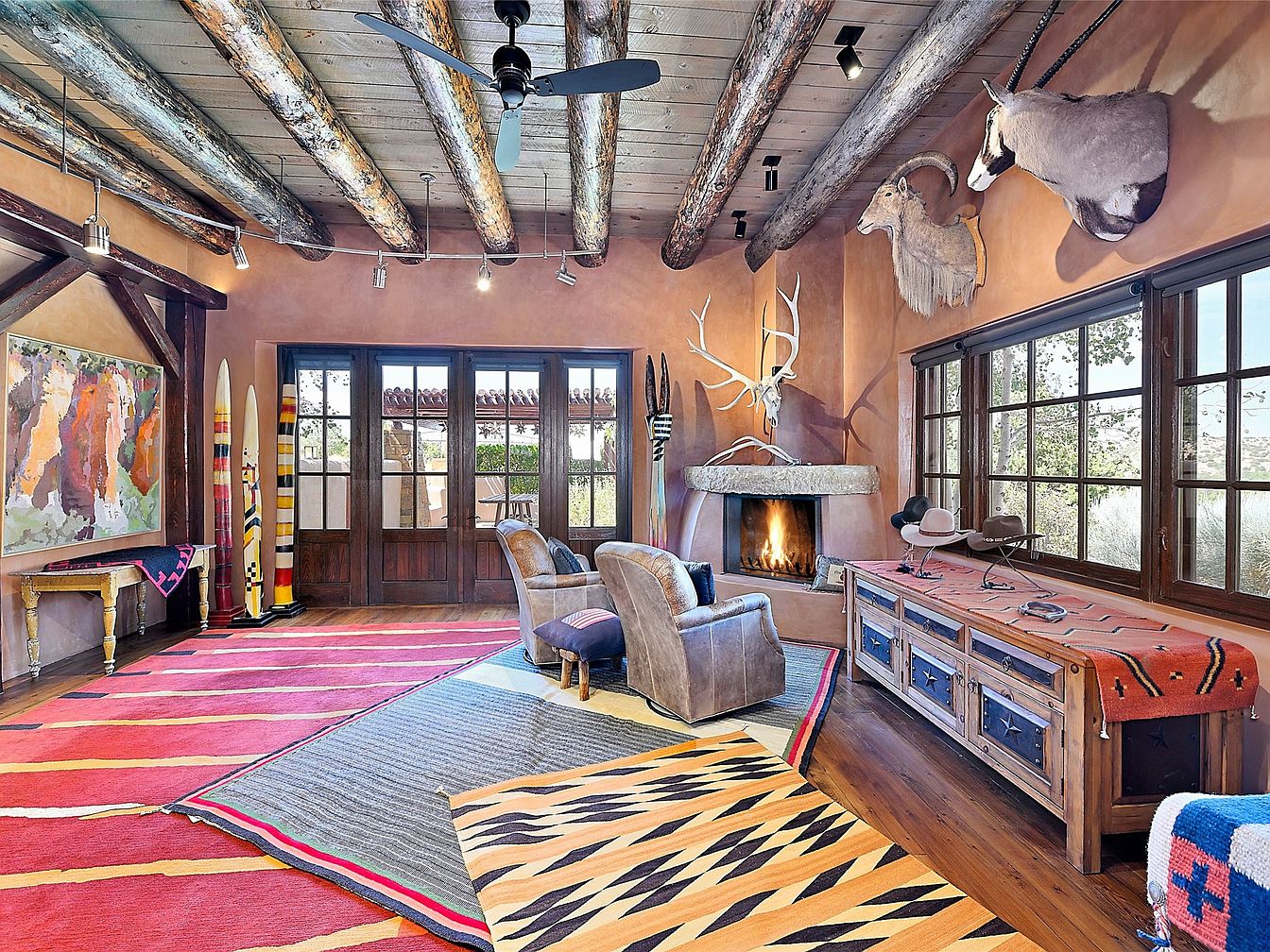 Warm and inviting, this spacious living room embraces Southwestern charm with exposed timber beams overhead and richly textured stucco walls. The cozy fireplace, adorned with antlers, is flanked by large windows that flood the space with natural light and offer scenic outdoor views. Family-friendly features include ample seating, soft area rugs for comfortable play, and durable wooden furniture with star and tribal motifs. Bold patterned textiles in earthy reds, yellows, and blues complement the colorful surfboards and eclectic wall art, creating an environment that is both vibrant and relaxing, perfect for gatherings or quiet relaxation by the fire.