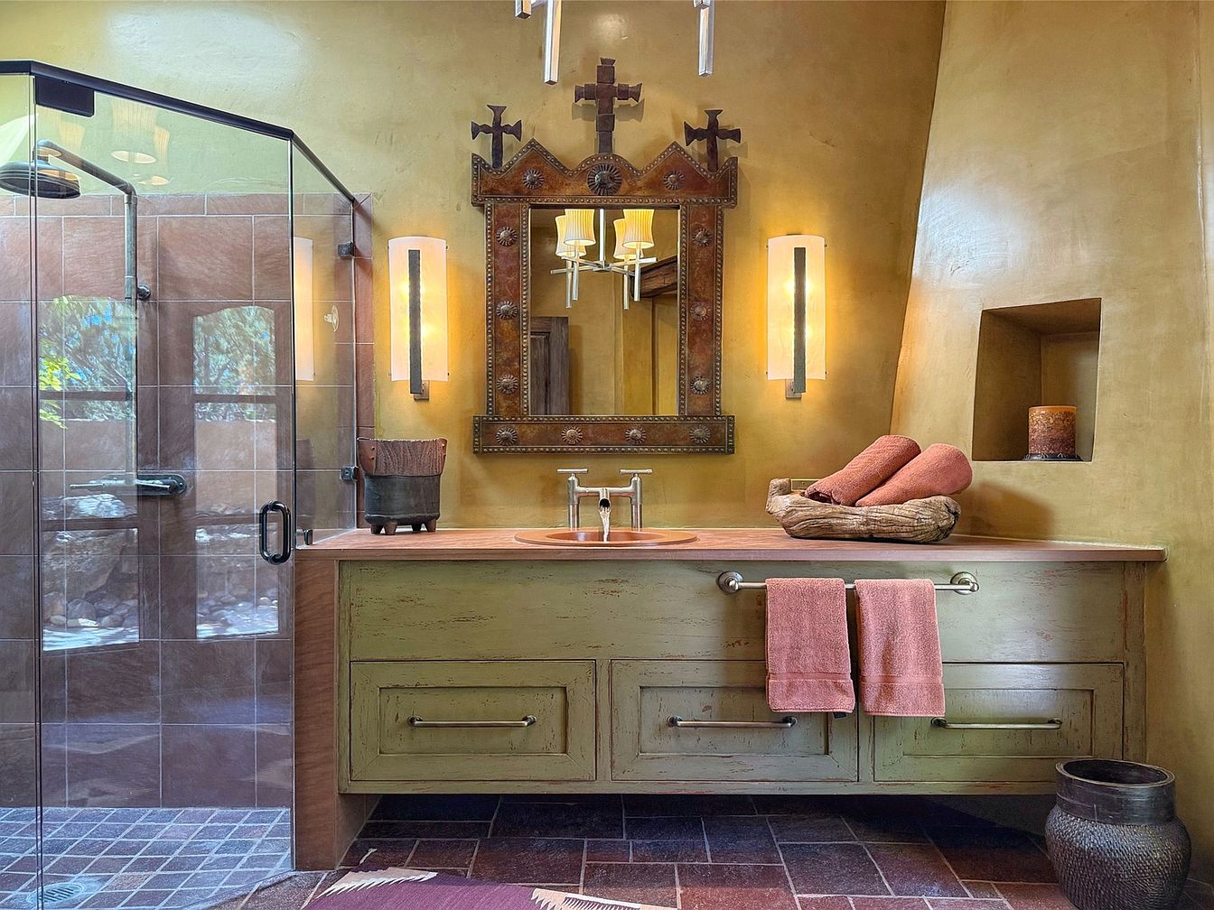 A warm Southwestern aesthetic infuses this bathroom vanity area, blending rustic elegance with practical design. Earthy, golden plaster walls create a cozy atmosphere, enhanced by a decorative wooden mirror with intricate cross details and two modern sconces casting gentle light. A sage green vanity features ample storage with large drawers, complemented by bronze hardware and topped with a natural wood countertop. Soft russet towels and a rustic basket enhance the inviting feel, while a built-in wall niche holds a candle for added charm. Adjacent, a glass-enclosed shower with earth-toned tiles makes the space both family-friendly and visually cohesive.