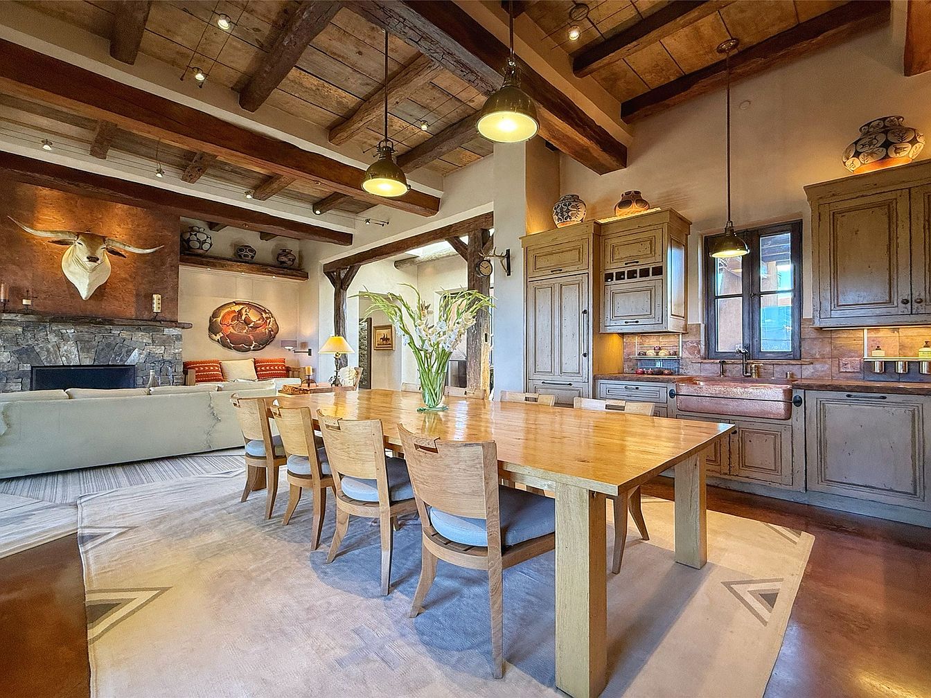 Warm rustic charm fills this open-plan dining and kitchen space, where exposed wooden beams and high ceilings create a welcoming atmosphere. The spacious wooden dining table comfortably seats eight, ideal for family gatherings or entertaining guests. Neutral tones and natural materials dominate, from the stone fireplace with Southwestern décor to the handcrafted cabinetry and copper farmhouse sink. Soft rugs soften the hardwood floors, while plush seating in the adjacent living area enhances comfort for all ages. Carefully curated accent lighting and cultural décor elements contribute to a sense of refined coziness, making it both stylish and inviting for families.