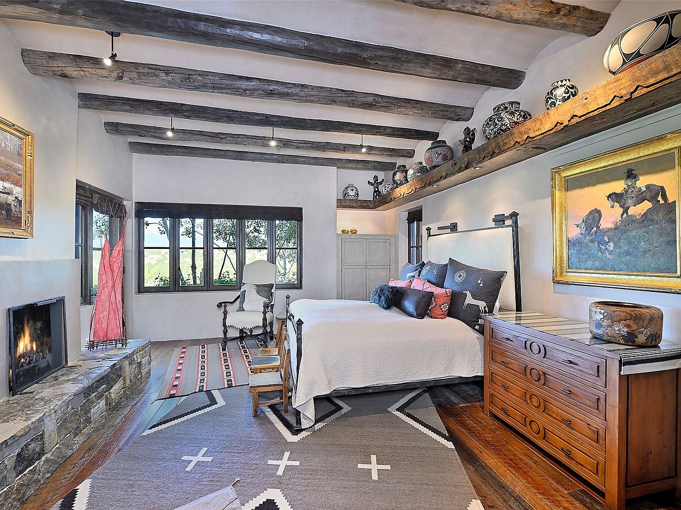 Warmth and rustic charm define this spacious bedroom retreat, featuring exposed wooden ceiling beams and a cozy stone fireplace perfect for family relaxation. The large windows flood the room with natural light and offer scenic views, while the neutral wall color sets a tranquil tone. Southwest-inspired textiles, including patterned rugs and throw pillows, add color and texture. The sturdy bed with an upholstered headboard anchors the room, complemented by substantial wooden furniture and a unique display shelf showcasing pottery and collectibles. Carefully selected artwork and practical seating nooks enhance the cozy, family-friendly atmosphere, making this an inviting space for all ages.