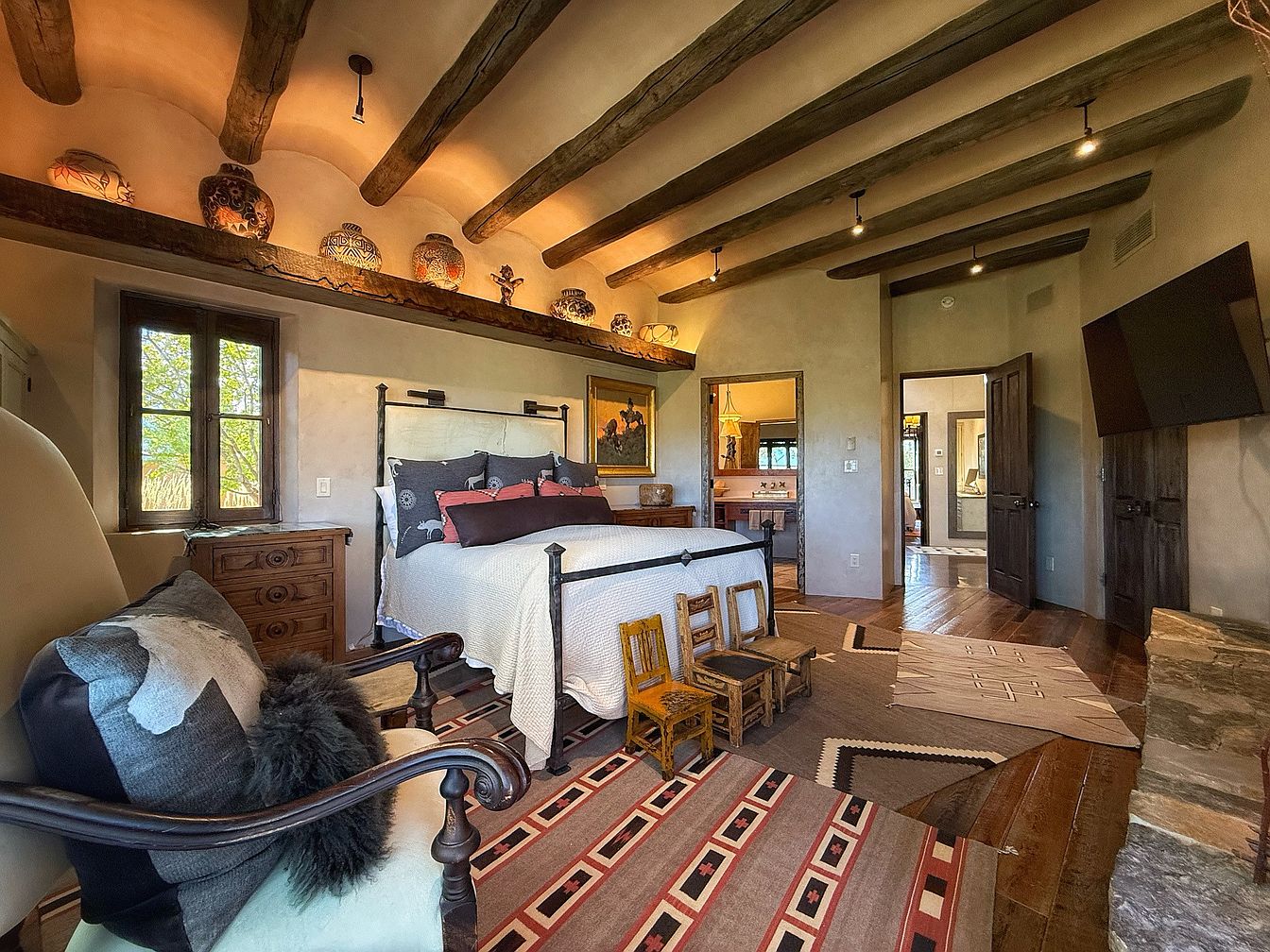 Warm earth tones and natural materials infuse this inviting bedroom with Southwestern charm. Exposed wooden beams on the curved ceiling create a cozy, rustic ambiance, while the neutral-colored plaster walls amplify natural light streaming through wooden windows. The bed is flanked by dark, elegant nightstands and accentuated with patterned pillows. Playful touches like miniature chairs at the foot of the bed and a plush armchair with textured pillows make the space family-friendly. Striking pottery displayed on an elevated shelf adds personality above. Layered rugs with geometric patterns and rich wood flooring enhance the homey, welcoming vibe that’s perfect for relaxing with family.