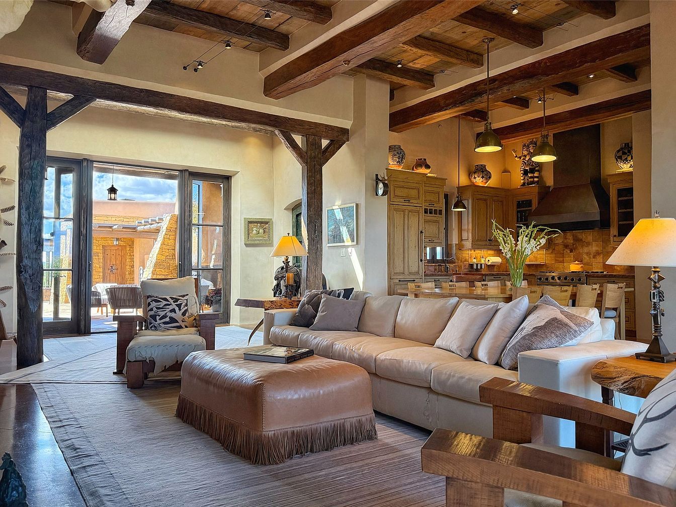 A spacious open living area blends warmth and comfort with Southwestern charm, connecting seamlessly to an inviting kitchen and a sunlit patio. Natural wood ceiling beams and pillars contrast elegantly with creamy stucco walls, while the large glass doors open to an outdoor sitting space, perfect for family gatherings. The plush sectional sofa and cushioned armchairs create ample seating, and playful patterns on pillows and ottoman add visual interest. Soft area rugs and earthy tones ensure a cozy, family-friendly atmosphere, while rustic cabinetry, pendant lights, and artistic pottery infuse the space with personality and timeless appeal.