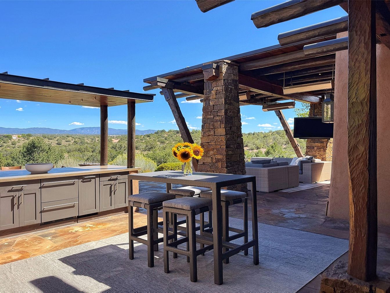 This inviting outdoor entertainment area blends rustic charm with modern comfort, featuring stone columns, exposed wooden beams, and expansive views of the surrounding landscape. The open kitchen includes sleek cabinetry and a large countertop perfect for meal prep or serving, extending the home’s living space effortlessly outside. Family-friendly seating options offer space for gatherings around a high-top table adorned with fresh sunflowers, while cushioned sofas create a comfortable lounge near a wall-mounted TV. Warm earthy tones and natural textures throughout the patio are complemented by ample shade, making the area ideal for family BBQs or relaxing weekends together.