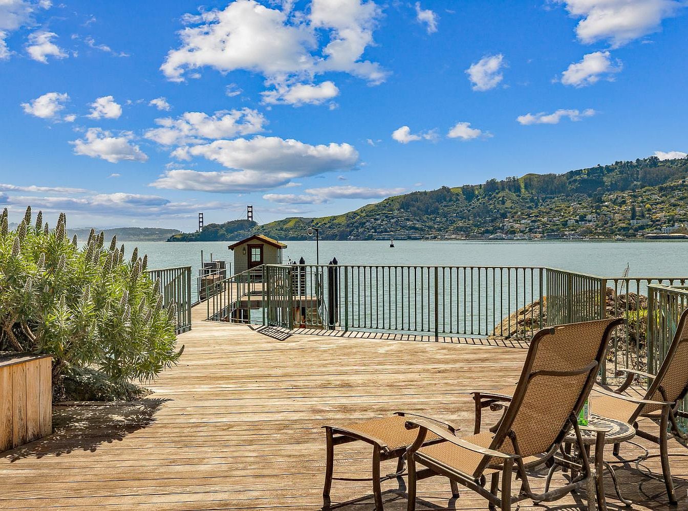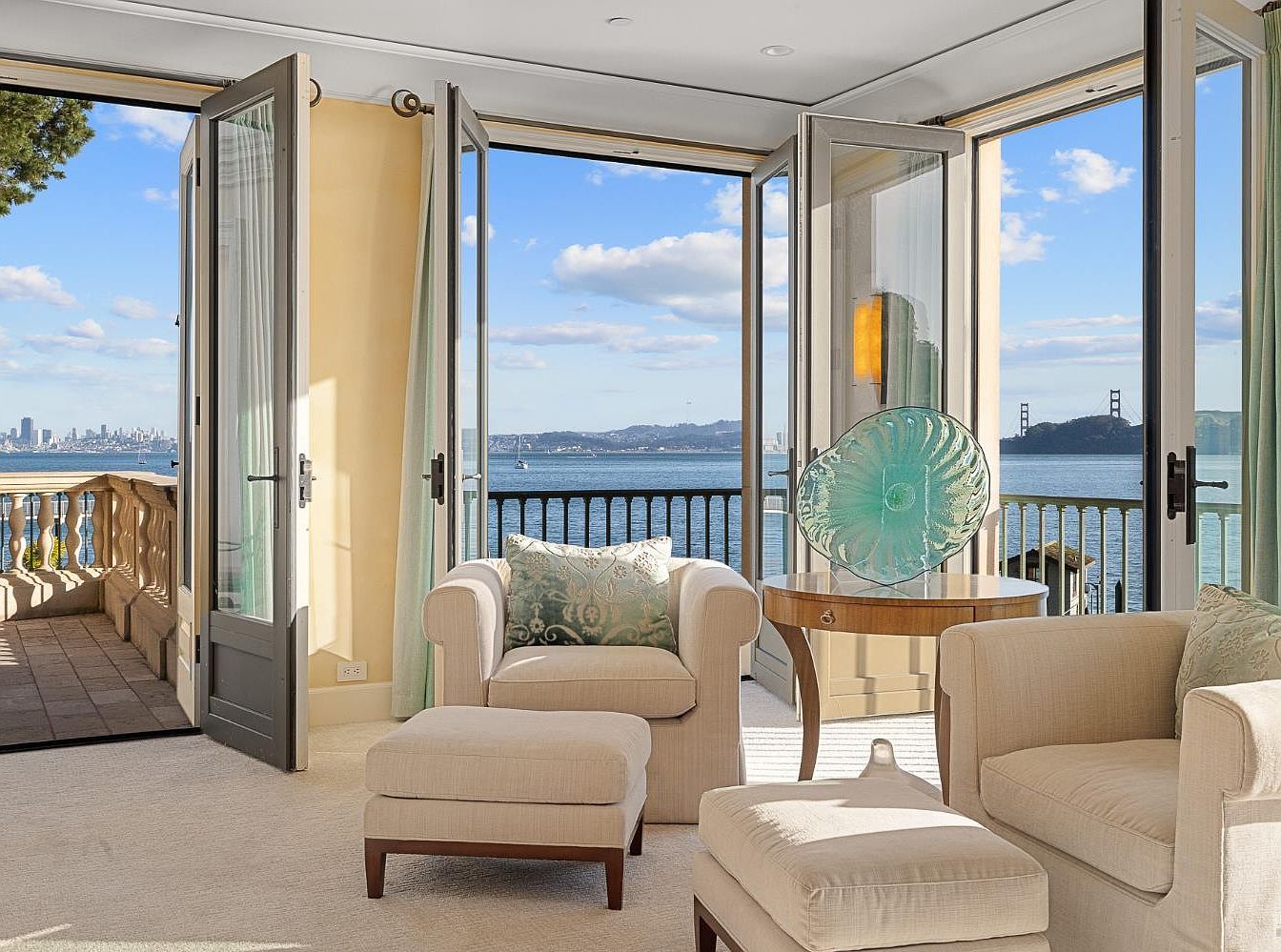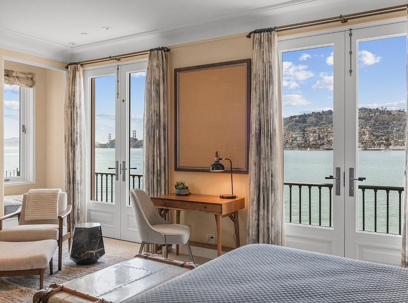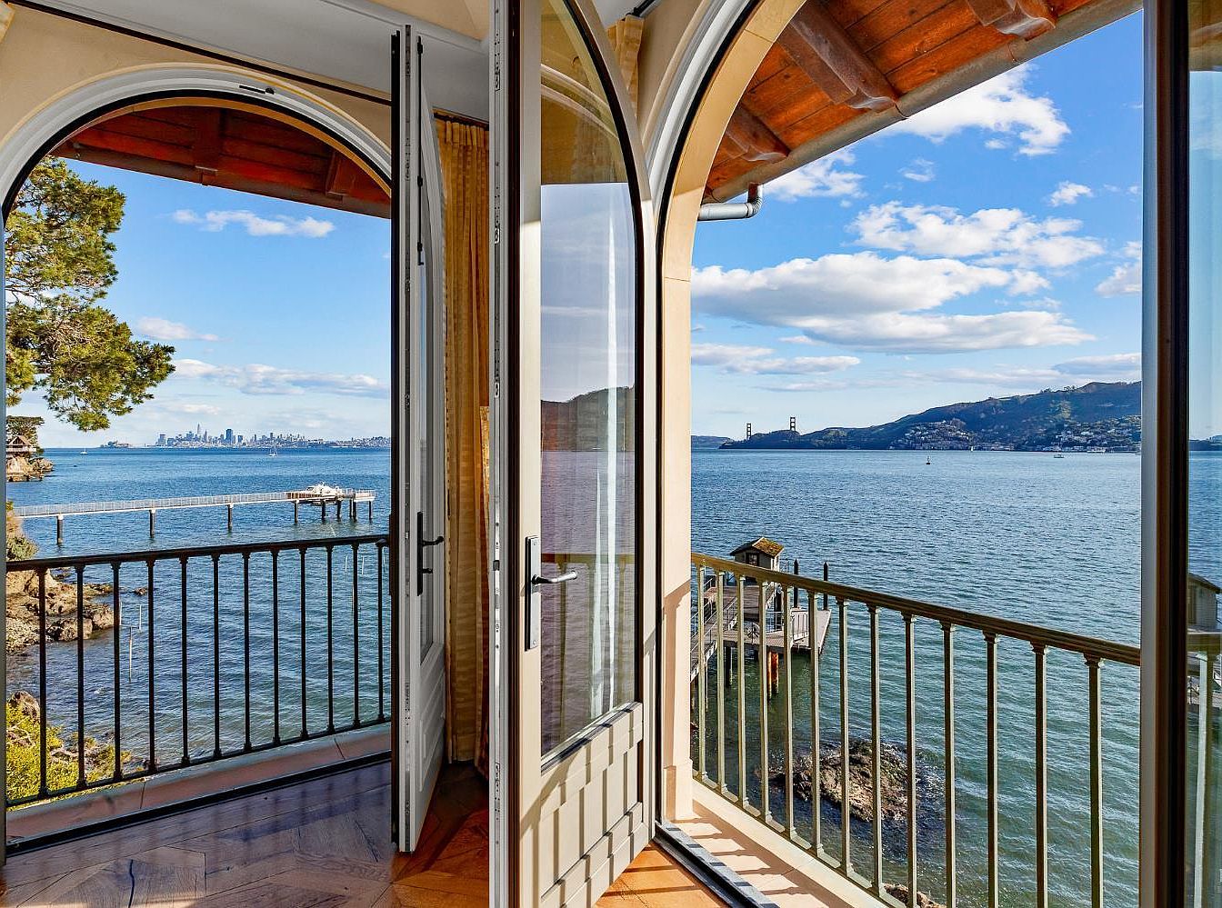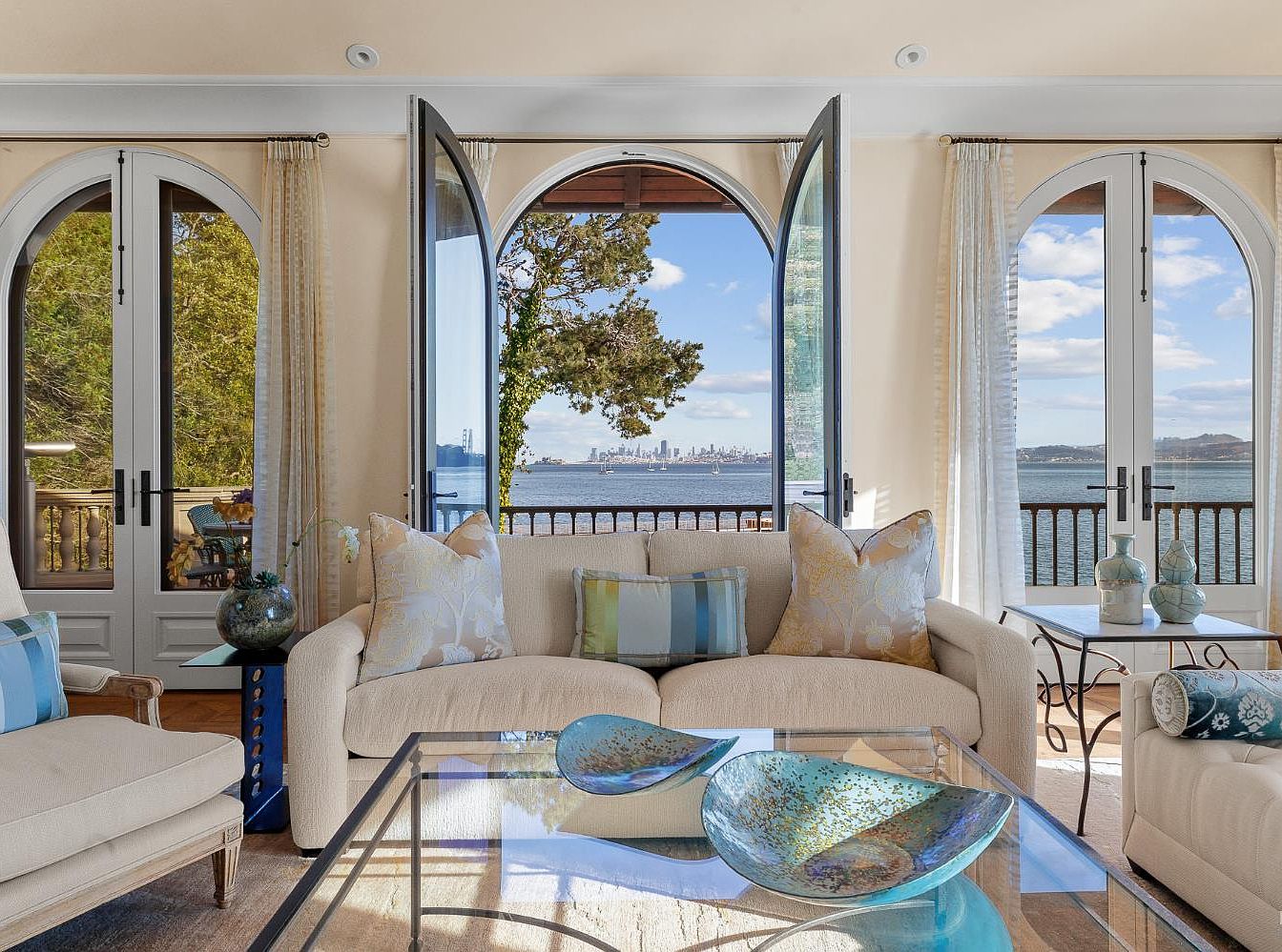 A stunning balcony framed by elegant arched doors opens directly onto panoramic water views, creating a peaceful and airy retreat ideal for family relaxation. Warm wood ceilings add timeless character, while the light herringbone floors provide a fresh, contemporary feel. The wrought iron railings provide safety for children without sacrificing aesthetics, making this a comfortable spot for everyone. Soft natural light streams through the expansive glass doors, complementing the earth-toned palette and enhancing the welcoming ambiance. The space invites indoor-outdoor living and offers breathtaking views of the bay, the city skyline, and iconic bridges beyond.