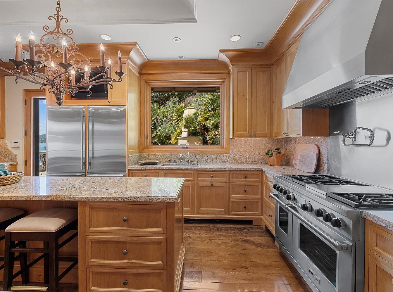 Warm wood cabinetry and golden granite countertops define this spacious, family-friendly kitchen. At the heart of the room is a generous island with ample seating for casual gatherings or quick breakfasts, complemented by plush upholstered stools. Stainless steel appliances, including a professional-grade range and oversized double-door refrigerator, ensure plenty of room for meal prep and entertaining. Natural light pours through a large picture window framing lush greenery, while recessed lighting and a classic chandelier add ambient glow. The room’s open layout, extensive counter space, and practical storage make it both visually inviting and supremely functional for daily family life.