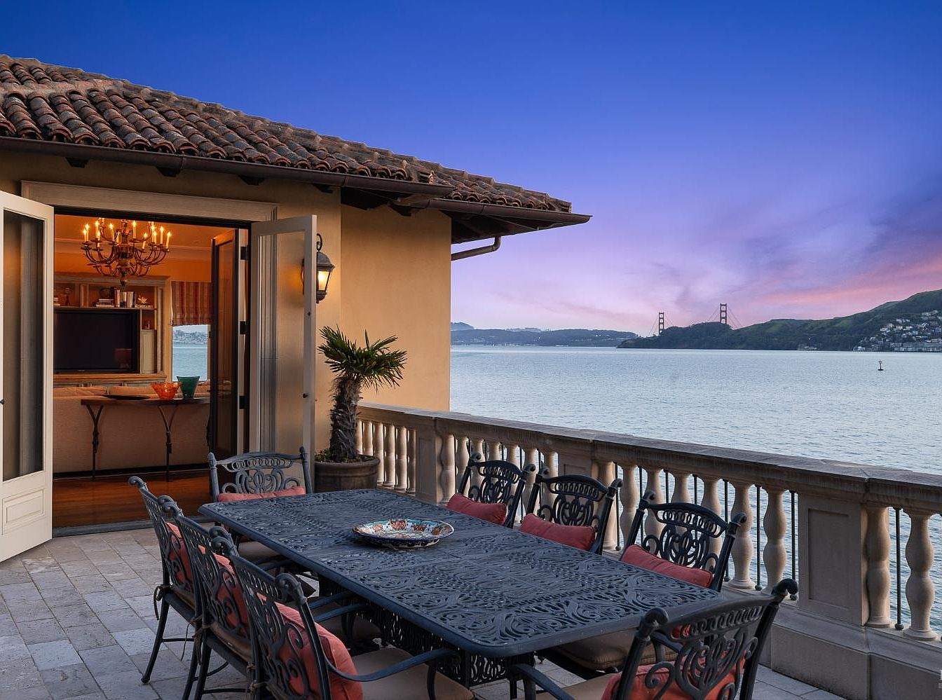 This scenic patio is nestled beside serene blue waters and surrounded by lush greenery, offering a tranquil oasis for relaxing or entertaining. Terra cotta roof tiles and creamy stucco walls reflect classic Mediterranean style, while red-cushioned seating around a large stone dining table ensures plenty of space for family gatherings. Elegant wrought-iron railings and lantern-style wall sconces add charm and safety, making it an ideal spot for children and adults alike. Vibrant natural landscaping creates a private, welcoming setting that seamlessly blends indoor comfort with breathtaking views of the bay and distant city skyline.
