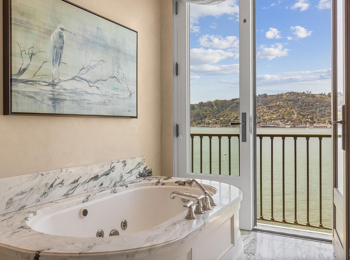 A luxurious bathroom retreat features a deep, marble-enclosed soaking tub positioned beside tall glass doors that open to a scenic waterfront balcony, inviting in abundant natural light and connecting the serene indoor space with breathtaking outdoor views. Soft, neutral wall tones create a calming atmosphere, complemented by tranquil artwork that enhances the spa-like ambiance. The elegant marble surround and modern fixtures elevate both style and comfort, making this bathroom an ideal spot for relaxation. Thoughtful, open access to the balcony offers fresh air and visual openness, ensuring a family-friendly, restful oasis perfect for unwinding after a busy day.
