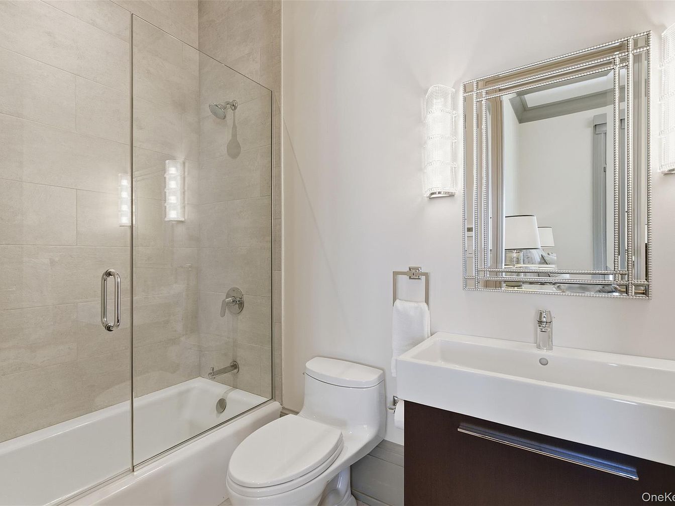 This bathroom features a sleek and contemporary design, ideal for families seeking both elegance and practicality. The space is anchored by a floating dark wood vanity with a rectangular, wide undermount sink, providing generous counter space for daily routines. Subtle beige tiles line the bathtub and shower walls, complemented by a frameless glass shower door for a seamless look. Chrome fixtures, a modern toilet, and a statement mirror with geometric detailing add sophistication. The soft, neutral color palette creates a calming atmosphere, while bright sconces flanking the mirror deliver ample task lighting, enhancing the space’s inviting and functional appeal.