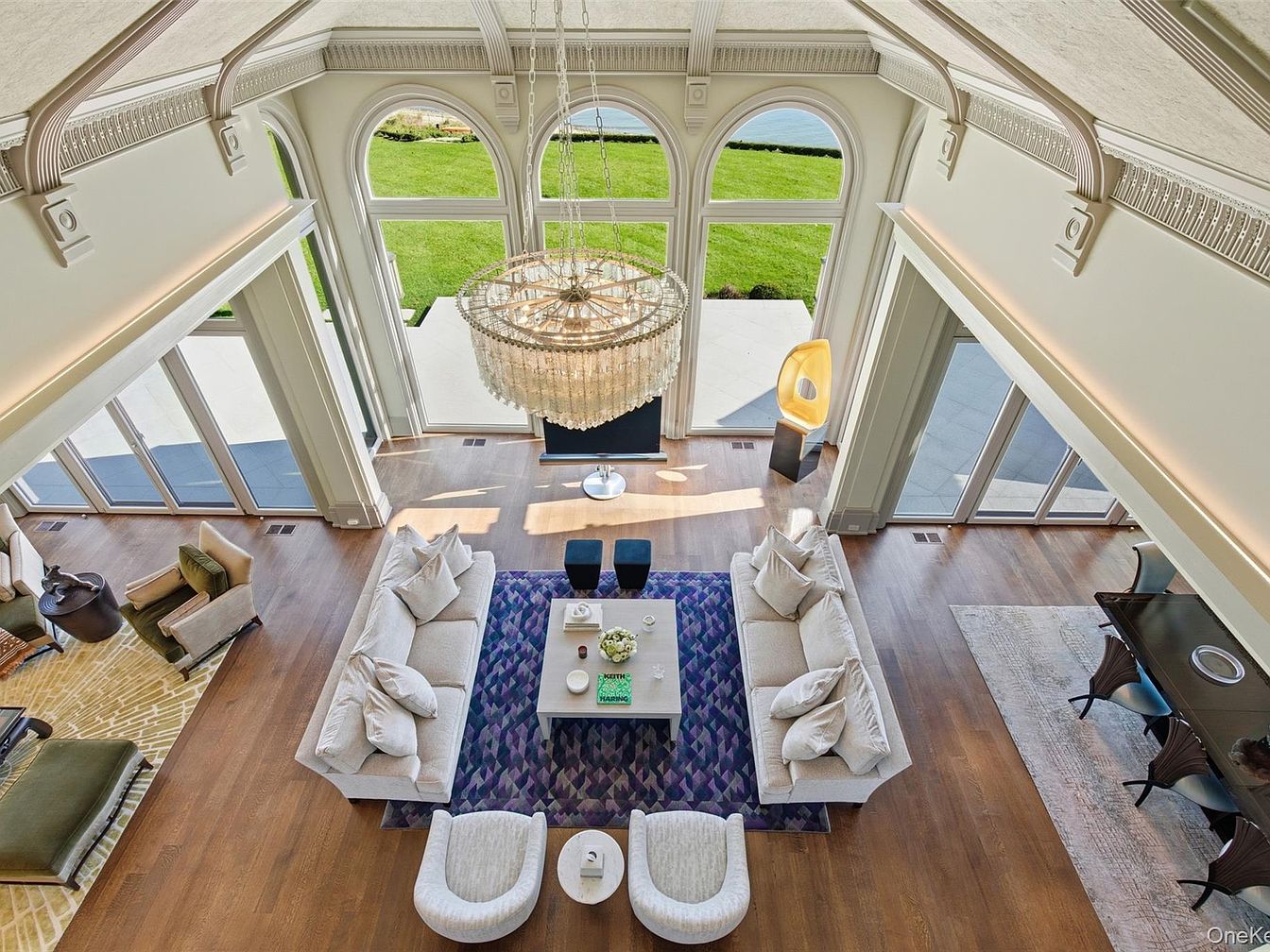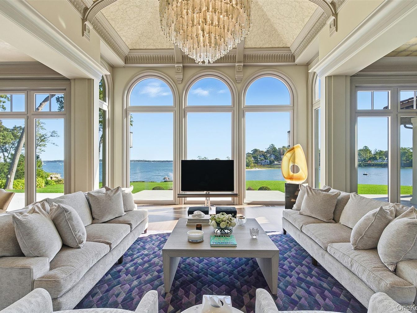 A grand living room features expansive bay windows that flood the space with natural light and offer breathtaking waterfront views. Plush, neutral-toned sofas arranged in an inviting conversational layout create a cozy, family-friendly atmosphere centered around a sleek, modern coffee table. The room’s airy palette is accented with a vibrant geometric area rug, adding color and warmth underfoot for children or gatherings. Intricate crown molding, soaring ceilings, and a sparkling chandelier provide an air of elegance, while modern lighting and simple decor keep the design fresh. The open plan seamlessly blends indoor comfort with serene outdoor beauty.