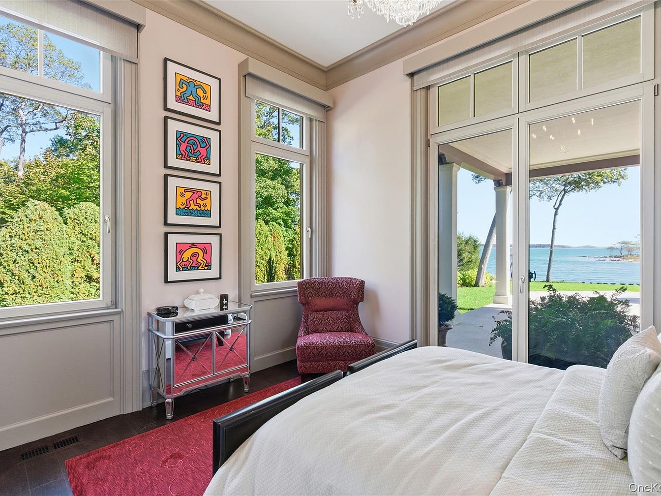 Expansive windows and glass doors fill this serene bedroom with natural light and frame stunning views of lush greenery and a sparkling waterfront. The space is thoughtfully arranged for comfort, featuring a plush, textured armchair in deep red, a mirrored nightstand, and contemporary pop art that adds playful energy to the pale, neutral walls. A simple yet elegant crystal chandelier provides ambient lighting. The neutral color palette, with pops of color from artwork and textiles, creates a soothing atmosphere that welcomes families. Access to a covered patio invites indoor-outdoor living, encouraging relaxation and connection with nature.